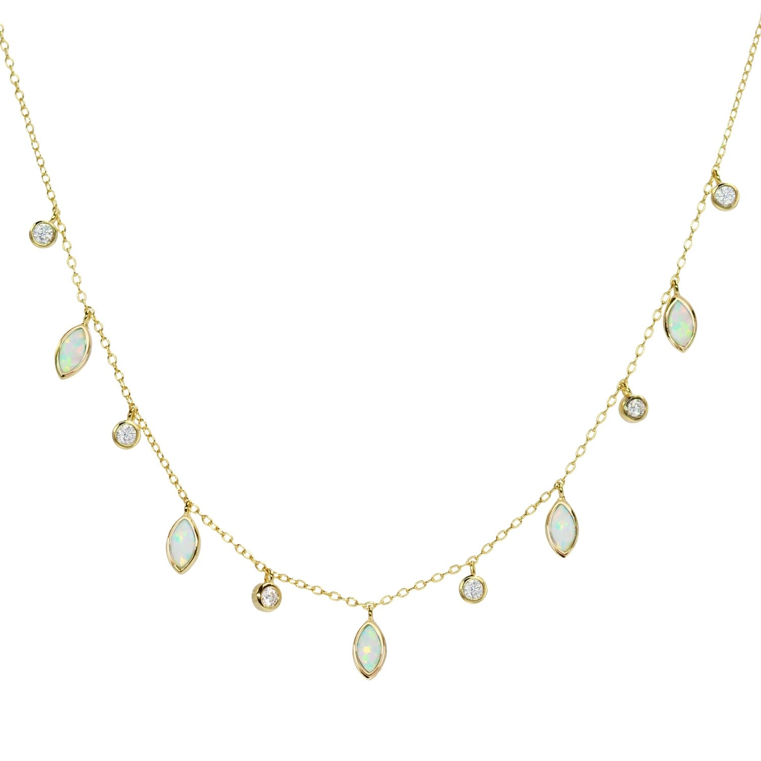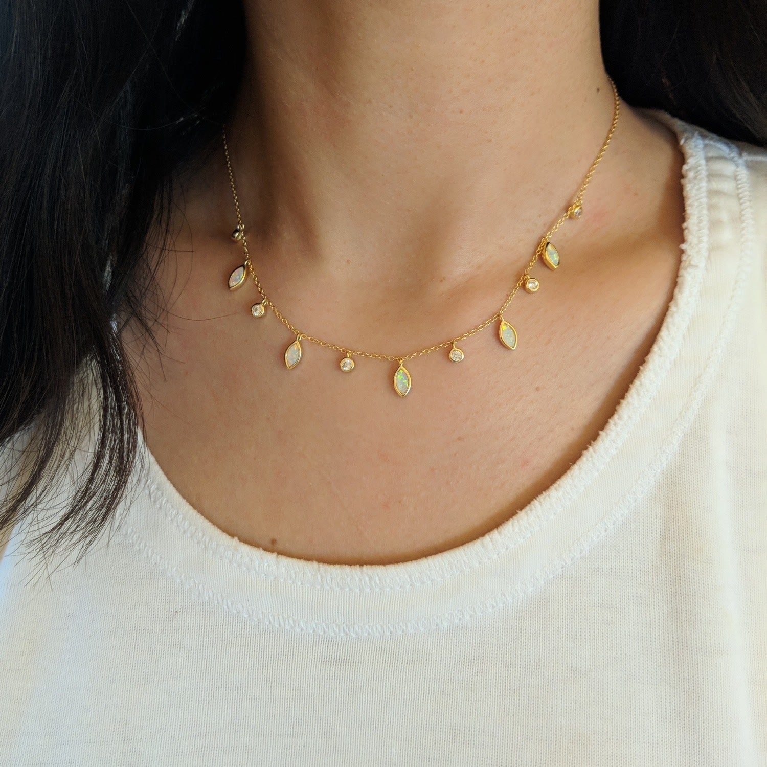 This necklace is made with 14k gold-plate over 925 sterling silver. It features black-rainbow, lab-grown opal drops and crystal accents. The length is adjustable up to 46cm with a silicon slider clasp.