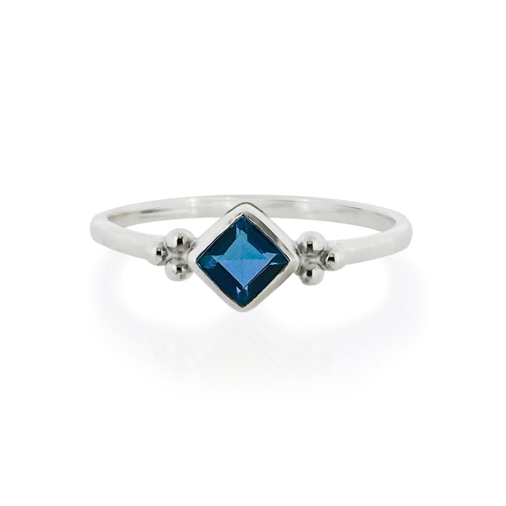 Sterling silver ring set with faceted London blue topaz (0.4cm x 0.4cm). Handmade.