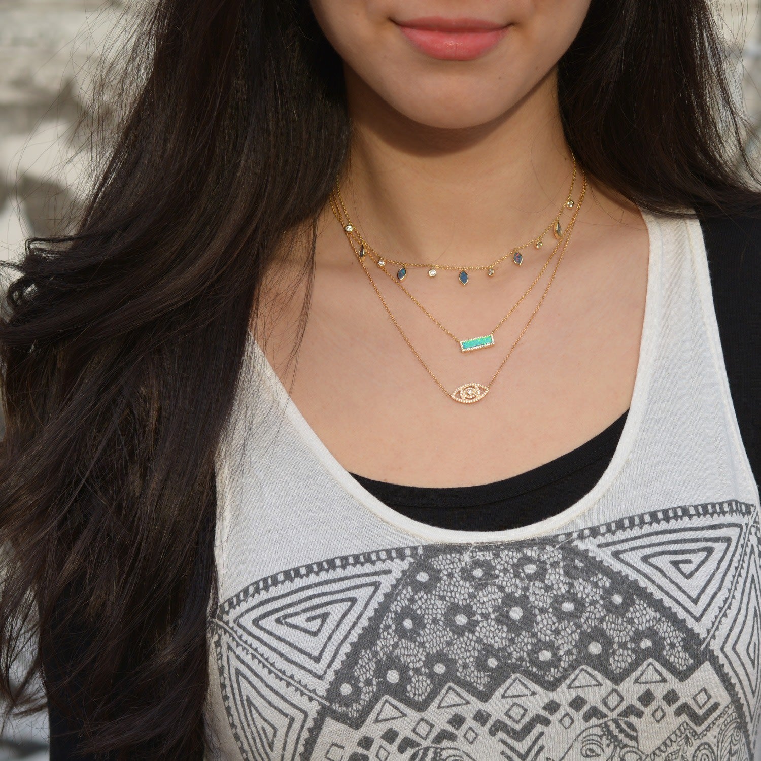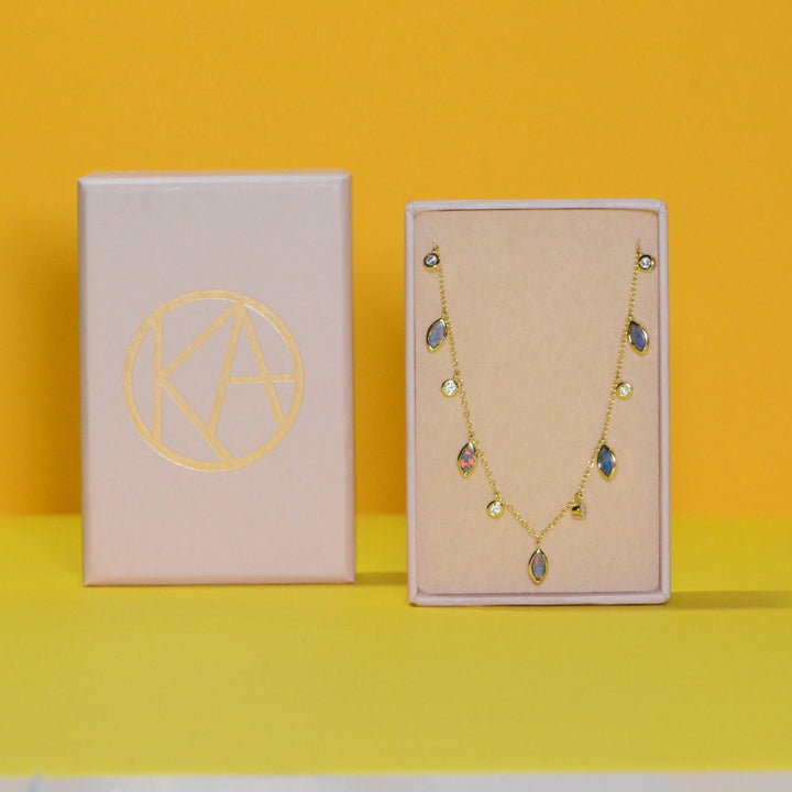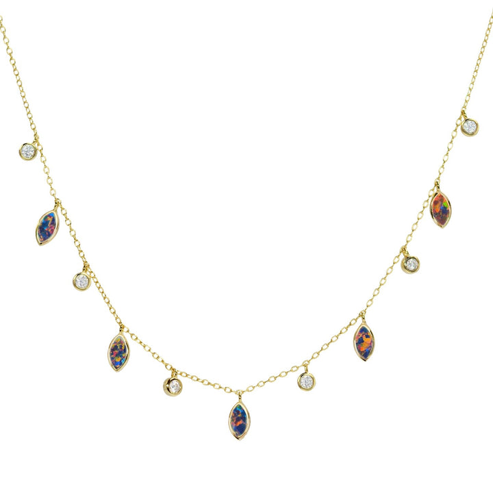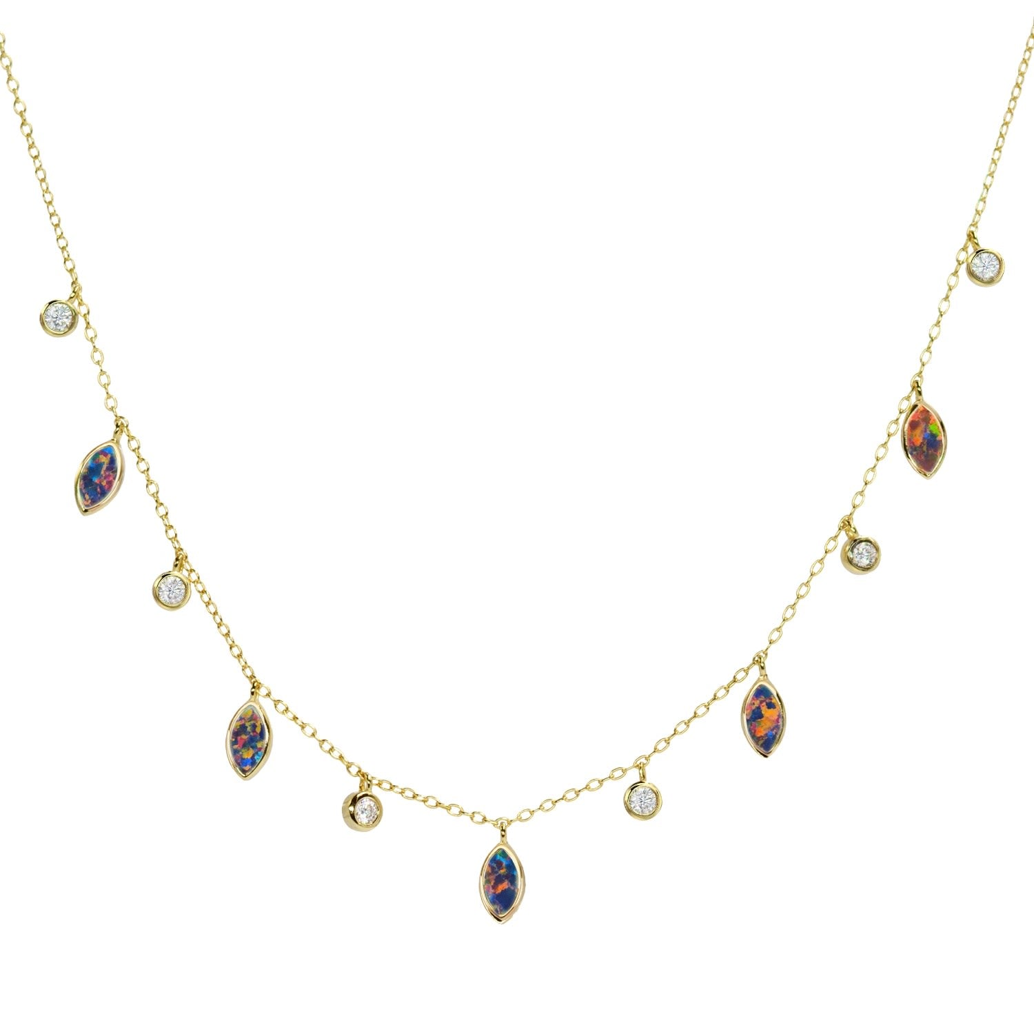 This necklace is made with 14k gold-plate over 925 sterling silver. It features black-rainbow, lab-grown opal drops with crystal accents and has an adjustable silicon slider clasp, with a maximum length of 46cm.