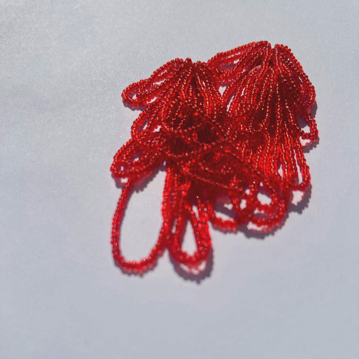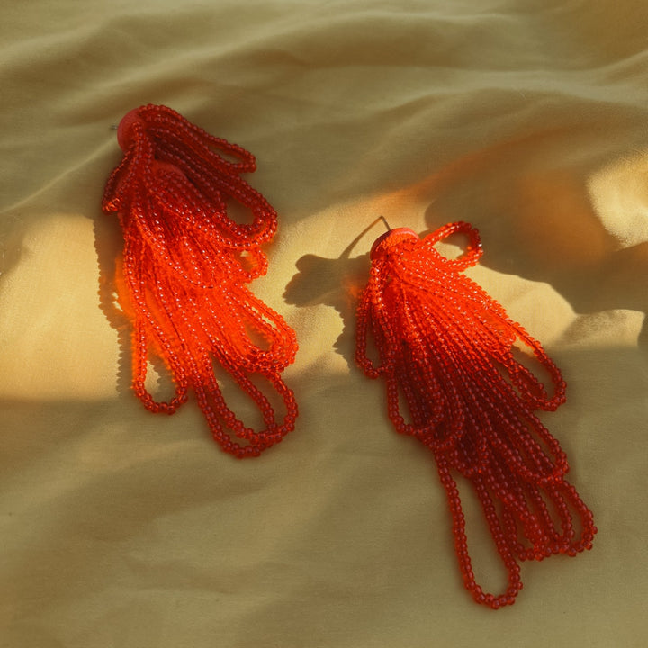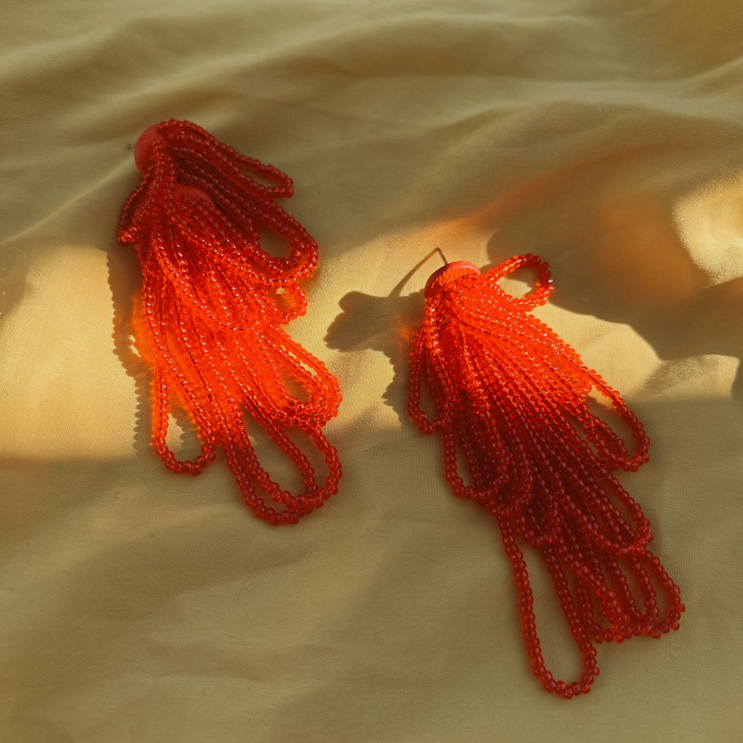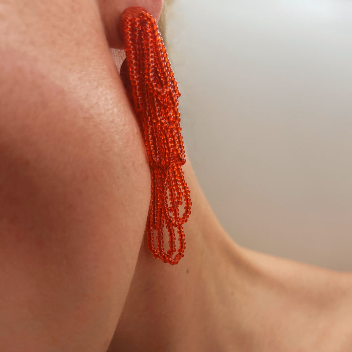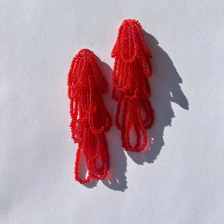 These Pulse Dangle Bead Earrings by Waiwai are a sculptural cascade of beads in a vivid red. Each strand is meticulously hand-stitched to a smooth leather base, creating a piece that is as refined as it is expressive. The layered strands sway with you, bringing a strong presence and fluid movement. These earrings are designed for a bold individual who wants to make a statement with a piece that is both artistic and full of life.