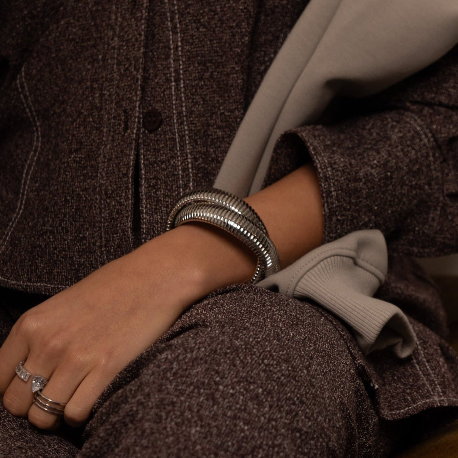 This Chunky Snake Bracelet - Silver by Shymi is a bold and modern statement piece that delivers a powerful, edgy aesthetic. Designed to appear as two bracelets in one, its chunky snake chain links create a striking, confident look. This versatile bracelet seamlessly transitions from casual daytime outfits to dressed-up evening ensembles, making it a must-have for anyone who loves to make a statement with their accessories.