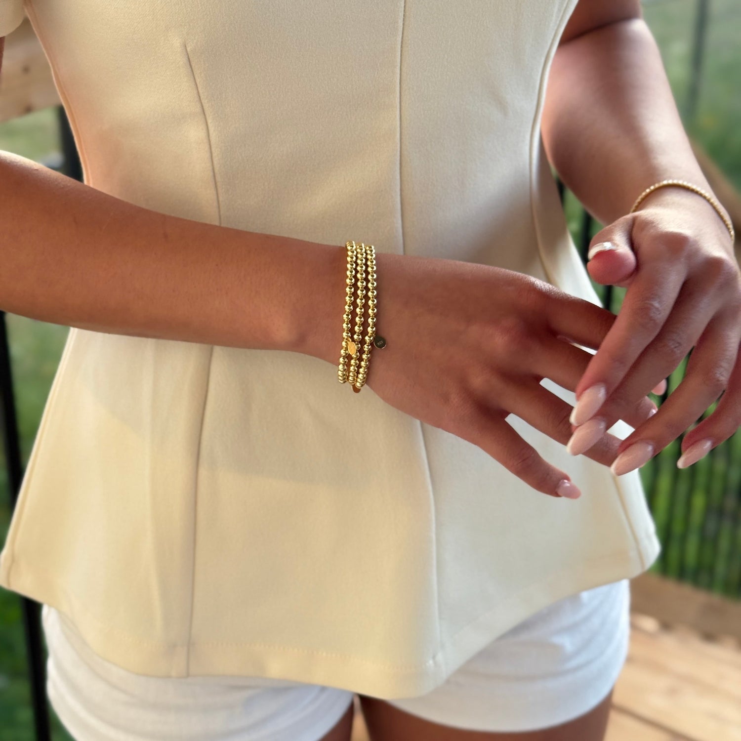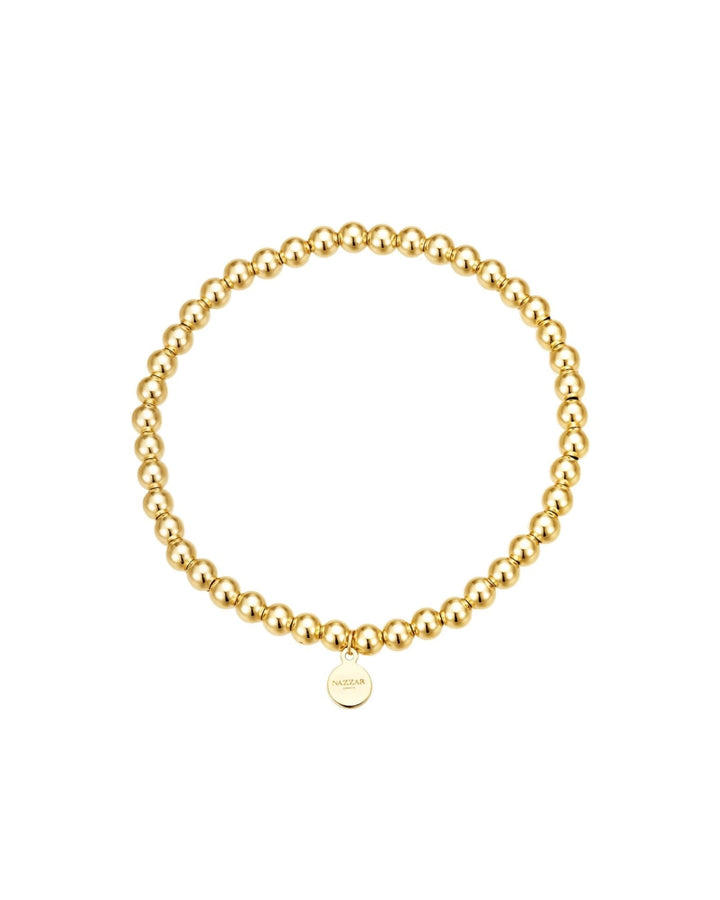This Gold Beaded Stretch Bracelet by Nazzar is a versatile and elegant accessory that can be worn alone or stacked. The 16k gold-plated sterling silver beads create a subtle yet luxurious shine. It is a hypoallergenic and durable piece perfect for elevating any look with its simple and chic design.