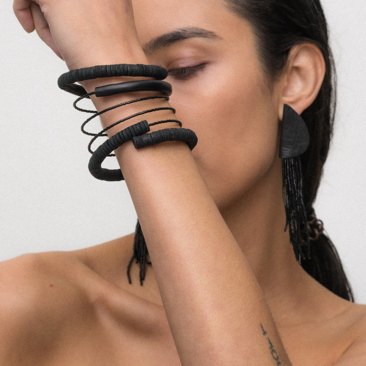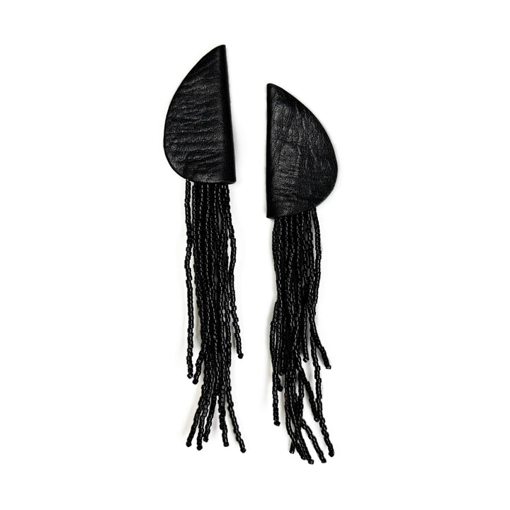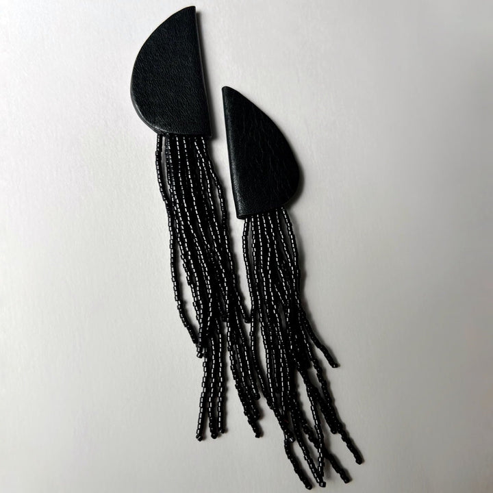 These Flowline Beaded Dangle Earrings Black by Waiwai merge organic strength with fluid grace. Structured black leather forms a bold base, while cascading glass bead tassels add shimmering movement. Lightweight and dramatic, they bring a sculptural edge to both day and night styling.