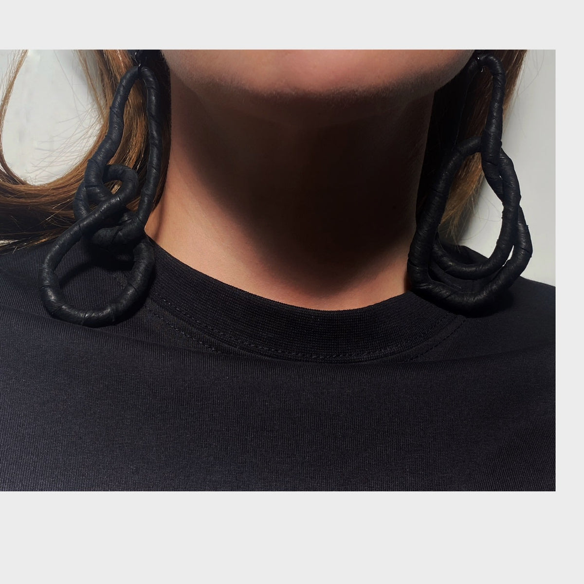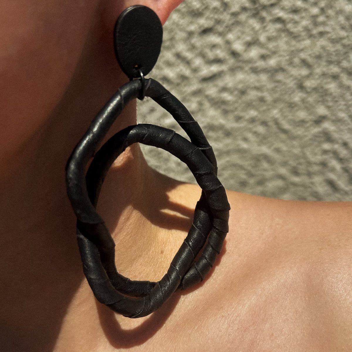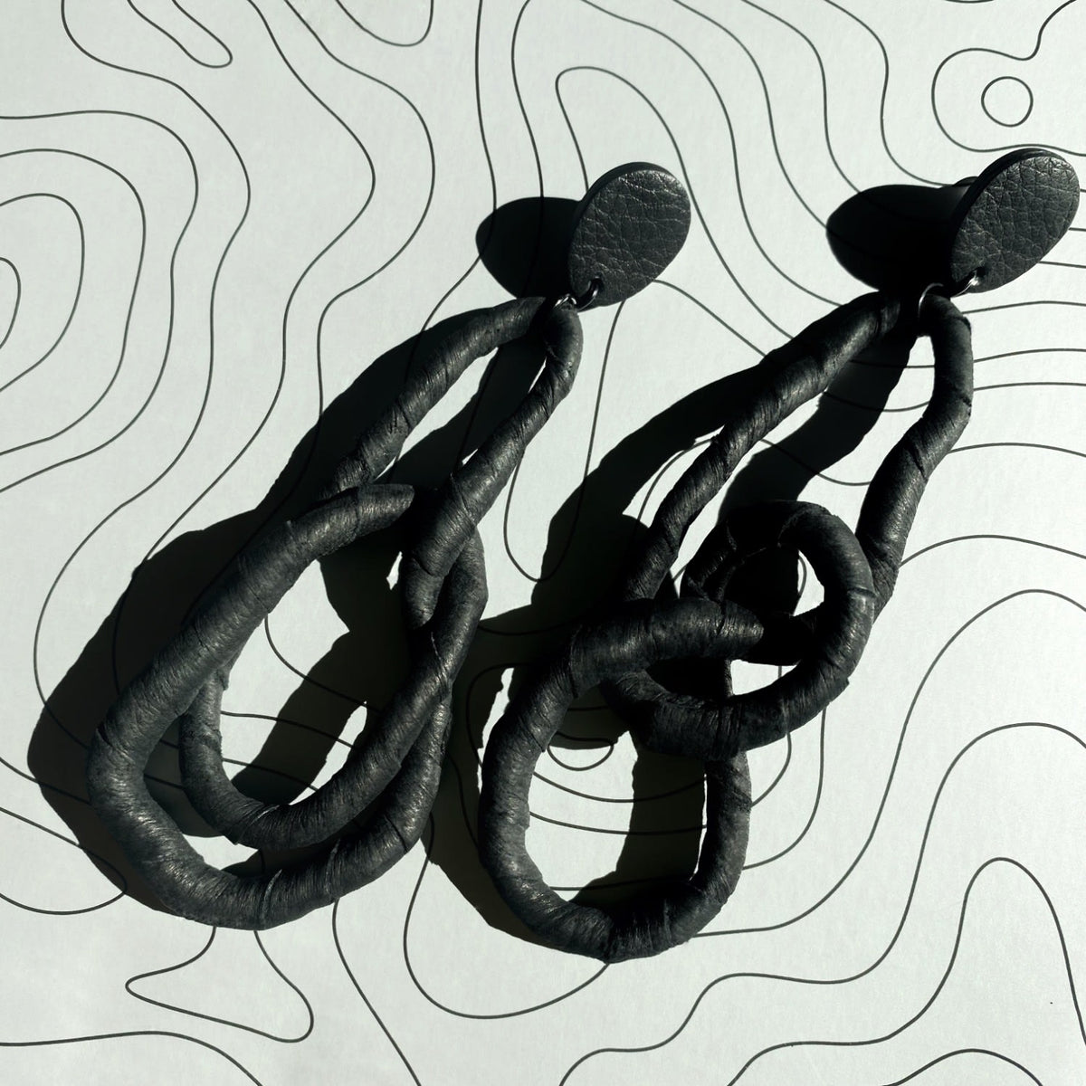 These earrings are made from a flexible wire wrapped in soft black leather. They feature a long, dangle-wrap design and are lightweight.