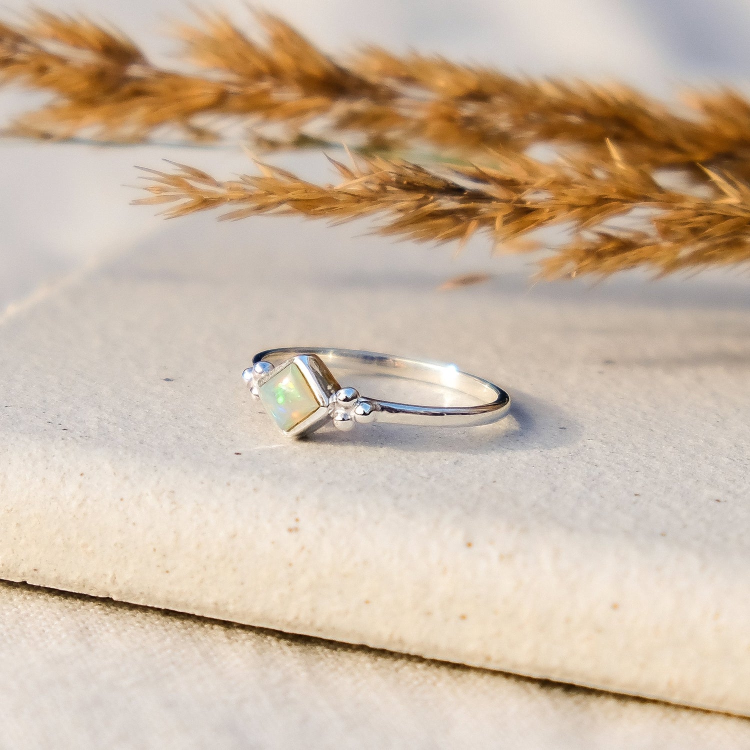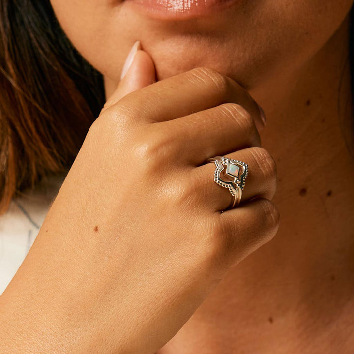 This Divinity Princess Silver Ring – Opal by Charlotte’s Web Jewellery radiates bohemian elegance with its princess-cut opal glowing in a silver frame. A stone of optimism and creativity, the opal shimmers with iridescent hues, perfect as October’s birthstone. Designed to be stacked or worn solo, it’s a timeless treasure of spiritual beauty.