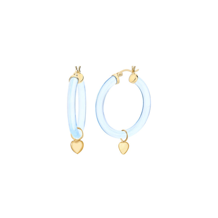 These handmade earrings are crafted with a lucite clear hoop and a blue, golden heart charm. The charm is removable, and the metal is not specified. They are a single pair.