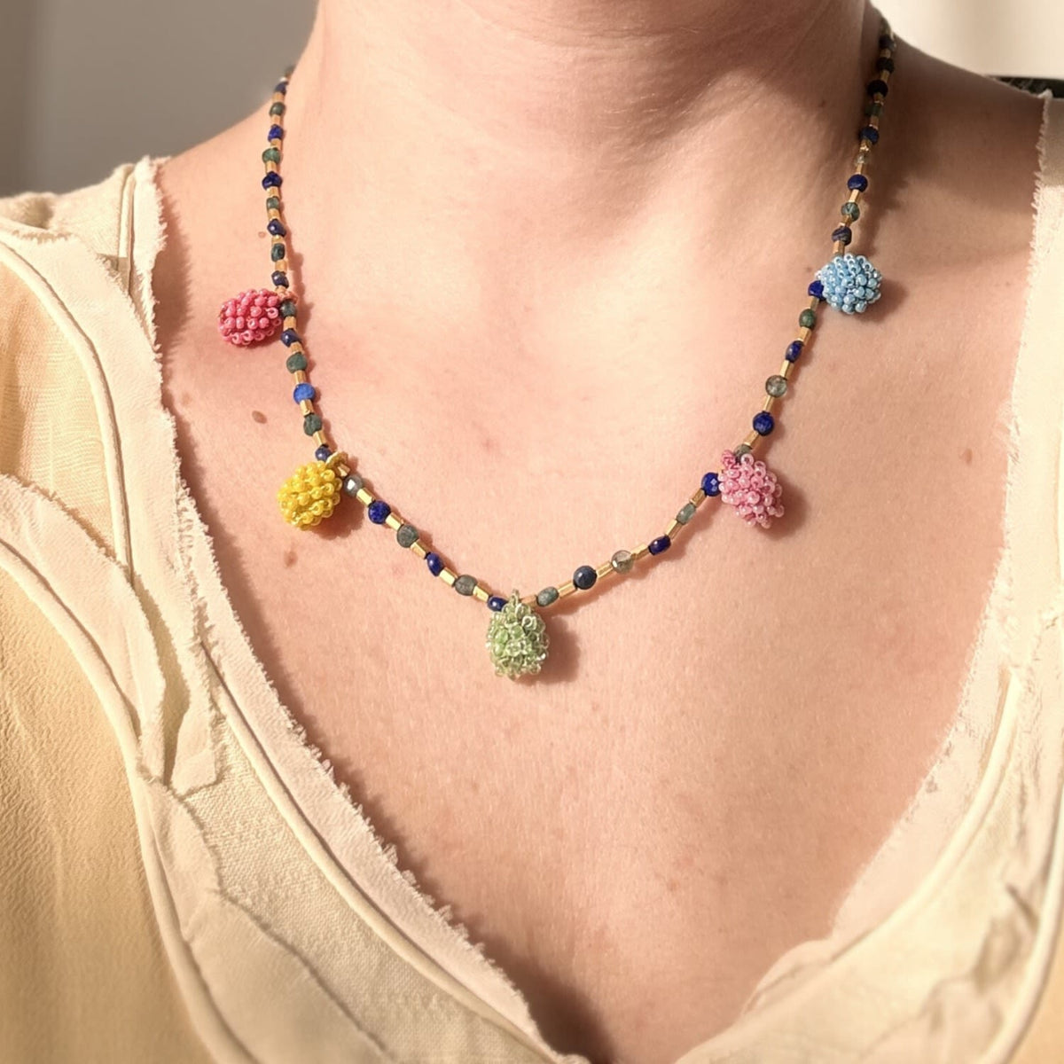 This Authentic Handmade Green Necklace by Black and Wild carries the spirit of Anatolian tradition. Each grape-shaped bead, crafted by skilled women artisans, is interspersed with iolite gemstones that bring depth and sophistication. The necklace is a wearable story of heritage and artistry, blending cultural richness with contemporary elegance. A piece for those who value authenticity, it connects past and present with grace.