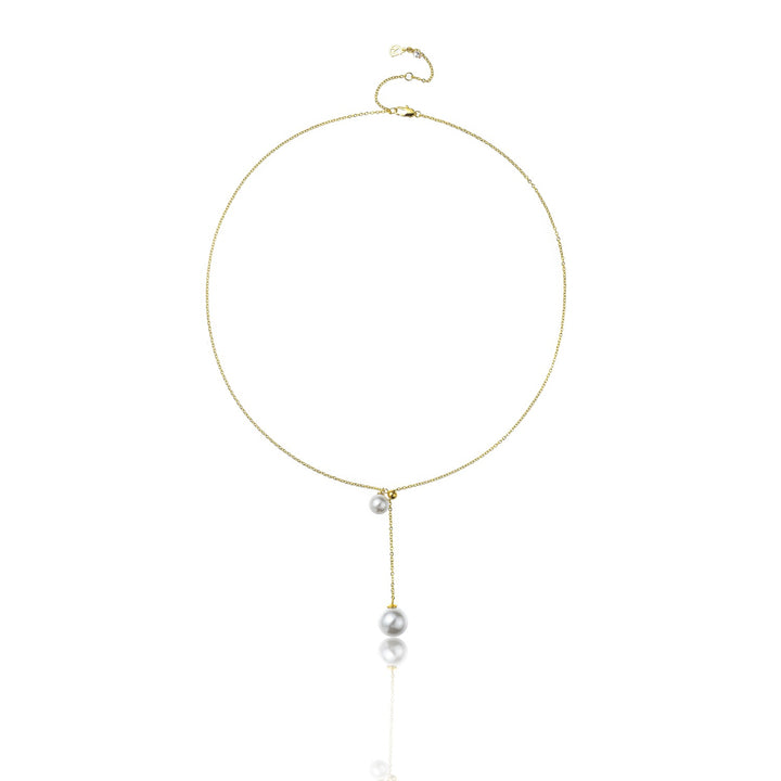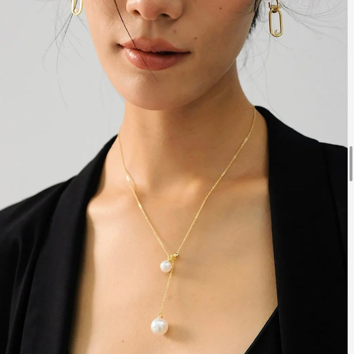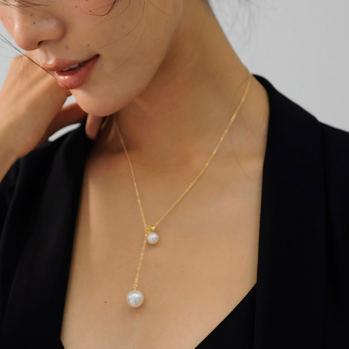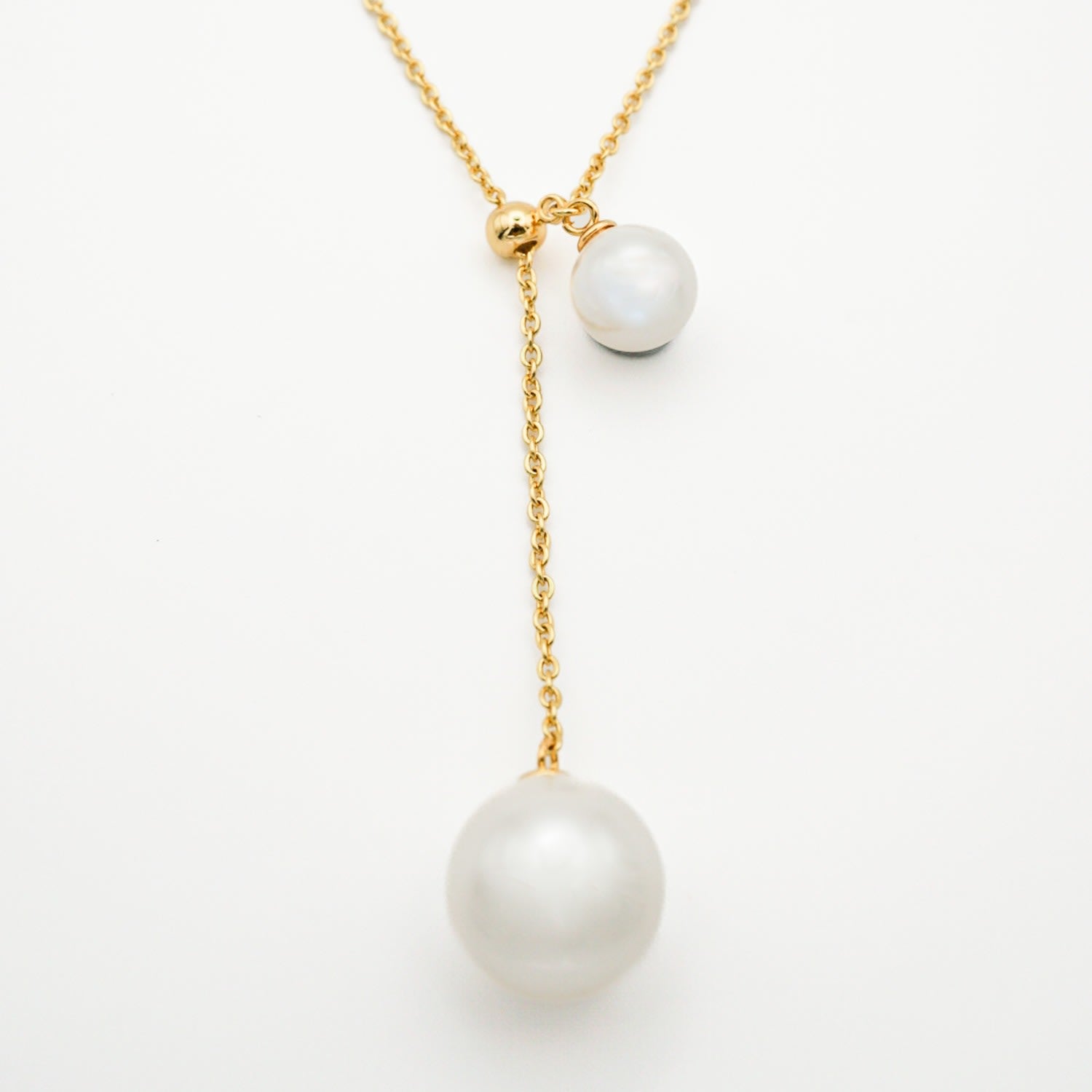 The specific materials of this necklace are not detailed in the product description, other than it features adjustable pearls on a chain.