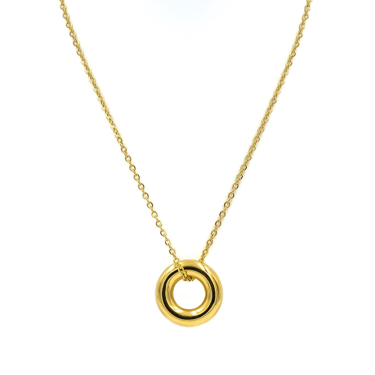 This necklace is made from tarnish-free 18k gold-plated stainless steel with a vacuum plating finish. It features a removable diamanté-encrusted circle pendant.