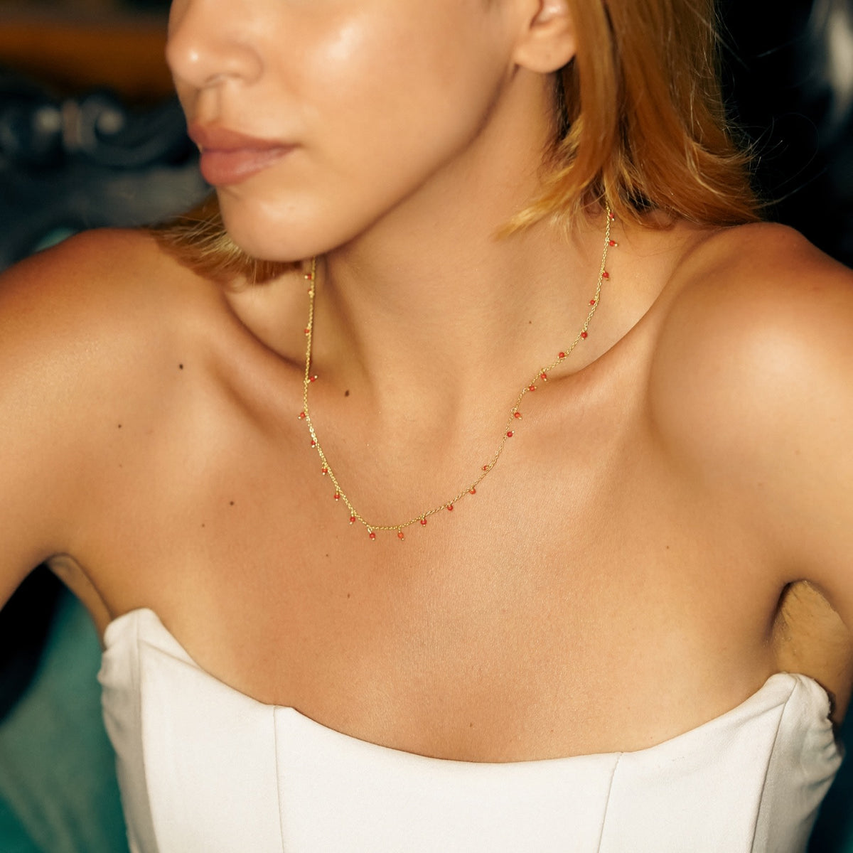This necklace is handmade from recycled 925 sterling silver with a gold tone. It features round beaded coral red stones in a dangling design.