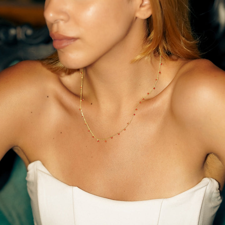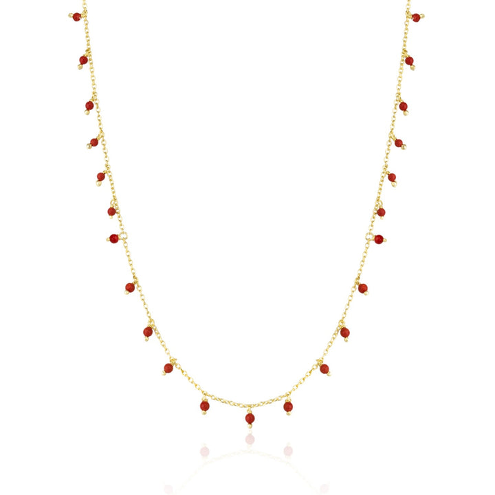 Red Coral Beaded Sterling Silver Chain Necklace - Gold