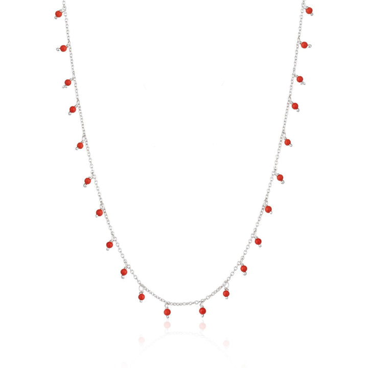 Red Coral Beaded Sterling Silver Chain Necklace - Silver