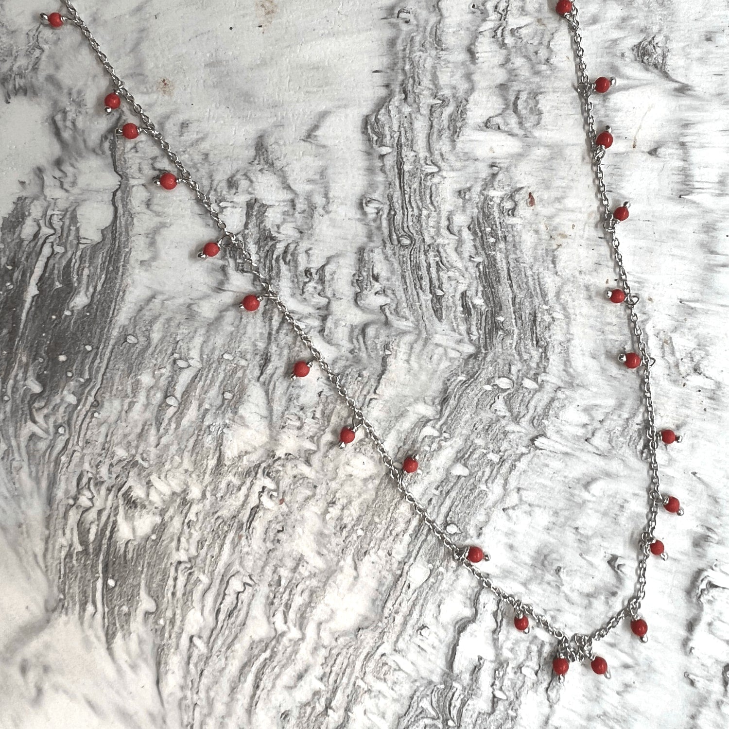 This necklace is handmade from recycled 925 sterling silver with a silver tone. It features round beaded coral red stones in a dangling design.