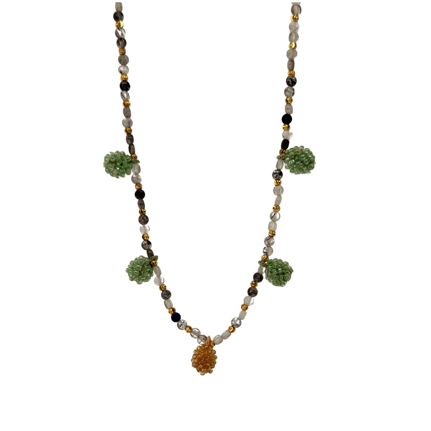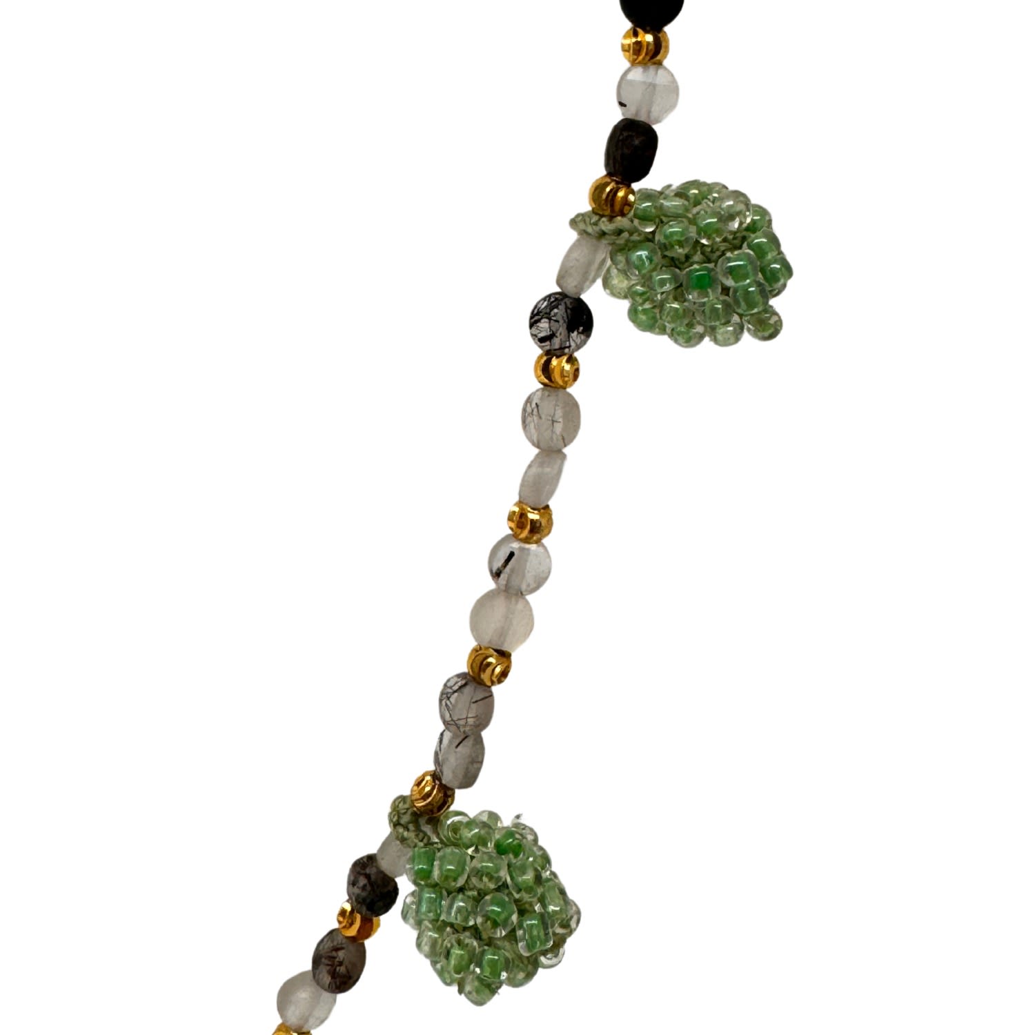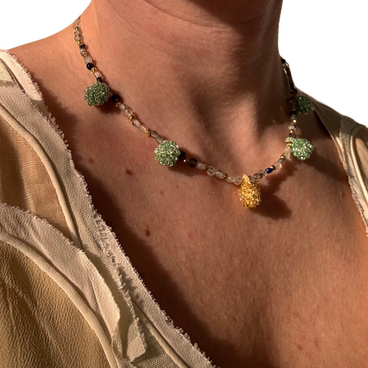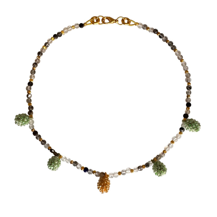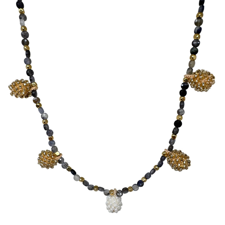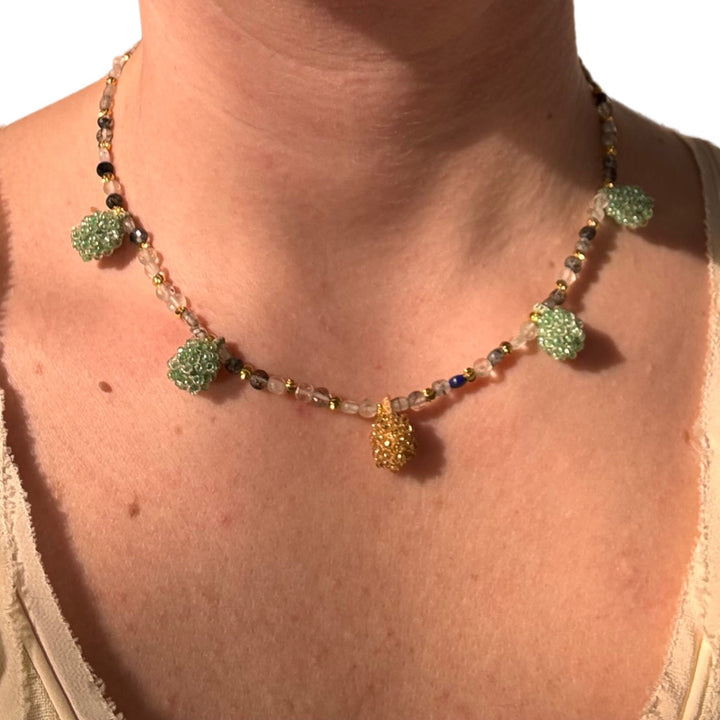 Handmade grape-shaped beads interspersed with iolite gemstones. Crafted by Anatolian artisans.