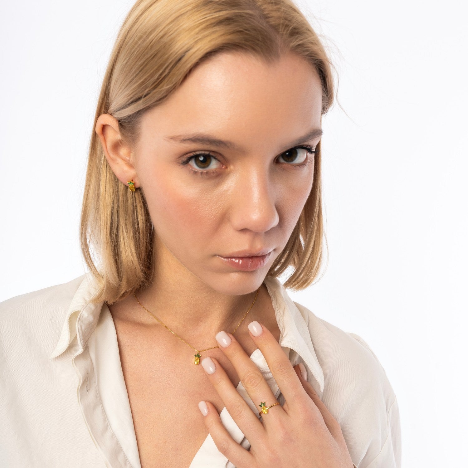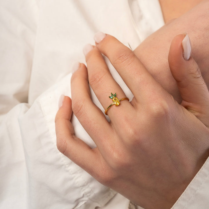 This ring is crafted from genuine sterling silver and features an adjustable band with a pineapple charm.