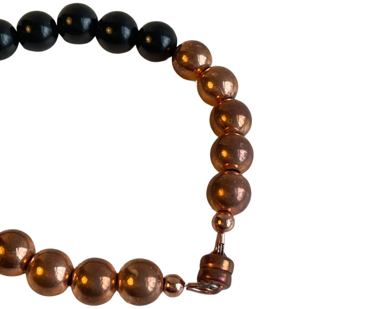 This bracelet is made of shungite and copper. It is designed as a bracelet for the wrist.