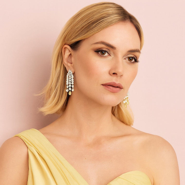 These Mia Diamond And Canary Cascading Pierced Drops by Michael Nash Jewelry are a breathtaking pair that adds a touch of Hollywood glamour to any look. The design features a stunning cascade of sparkling diamond cubic zirconia, accented with brilliant canary pear-shaped drops. So exquisitely crafted they are almost indistinguishable from the real thing, these earrings are perfect for dressing up a little black dress or a gala gown.