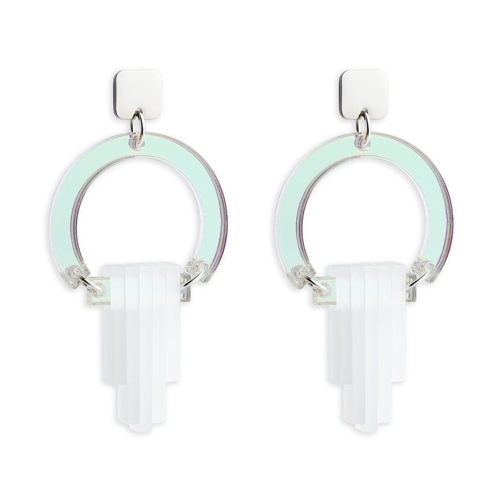 These chandelier earrings feature iridescent and white frost materials. The silver ear tops are cast from solid brass, plated in rhodium, and finished with a surgical steel ear post.