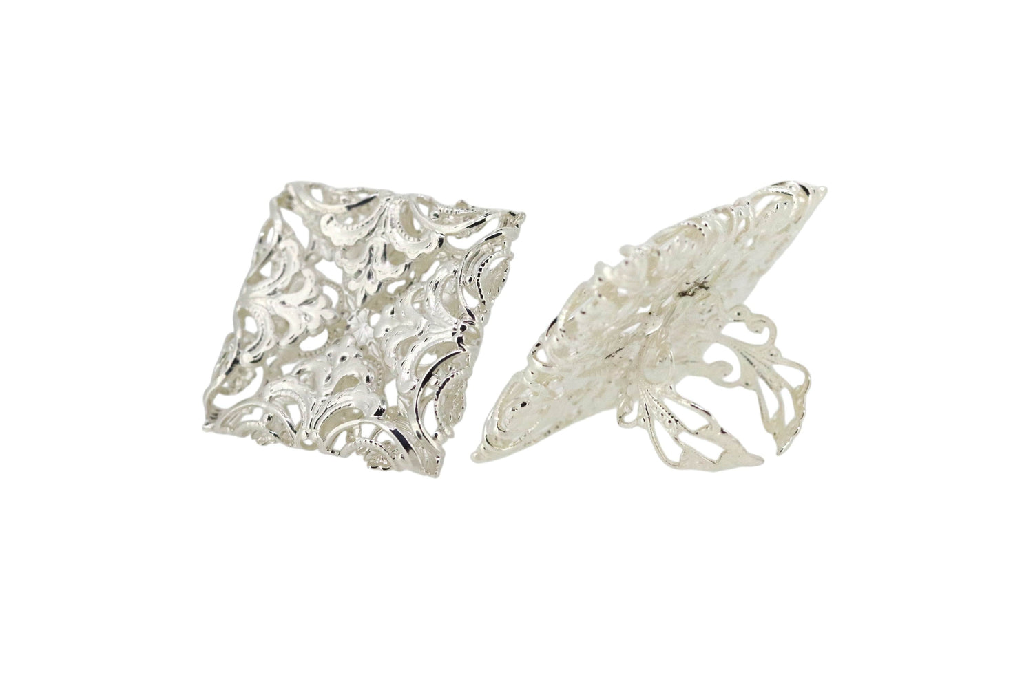 This ring is a large, intricate piece crafted from sterling silver-plated, nickel-free brass. It has a square shape with a filigree design.
