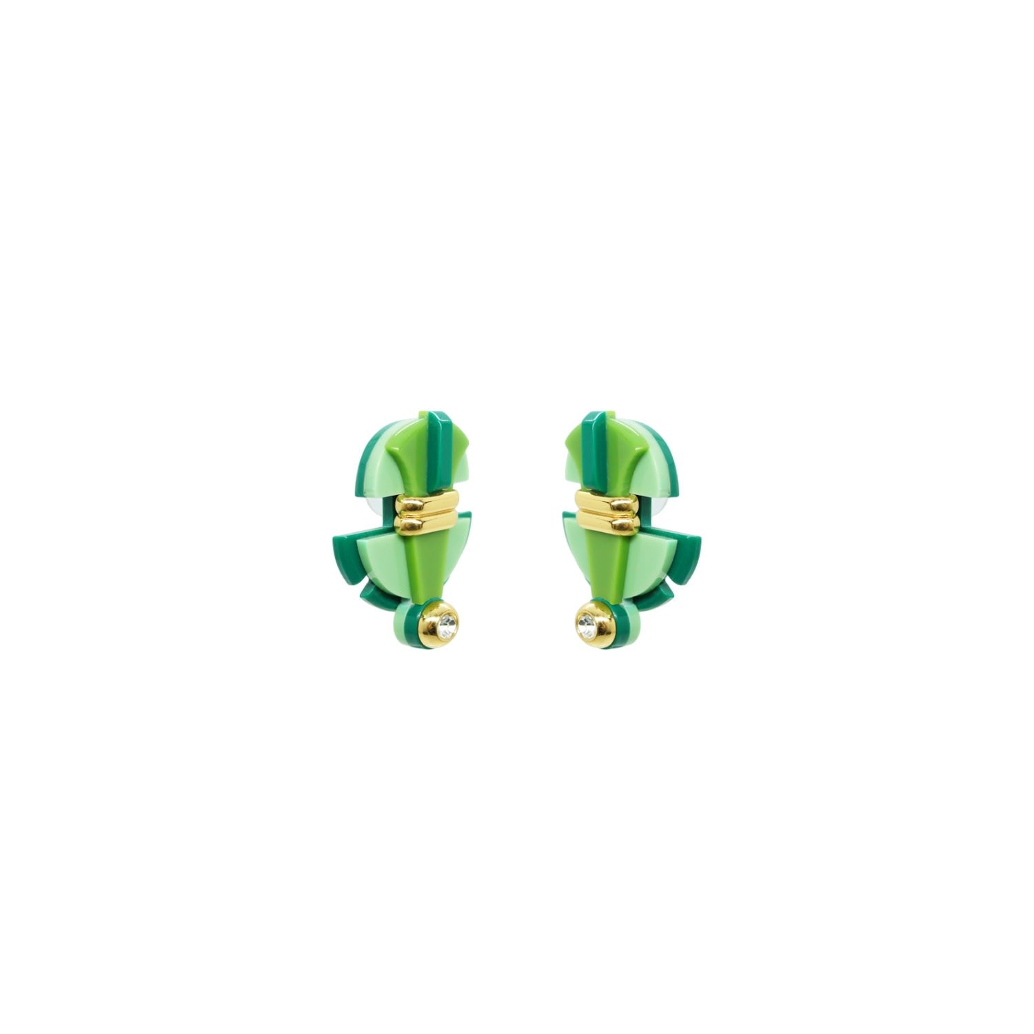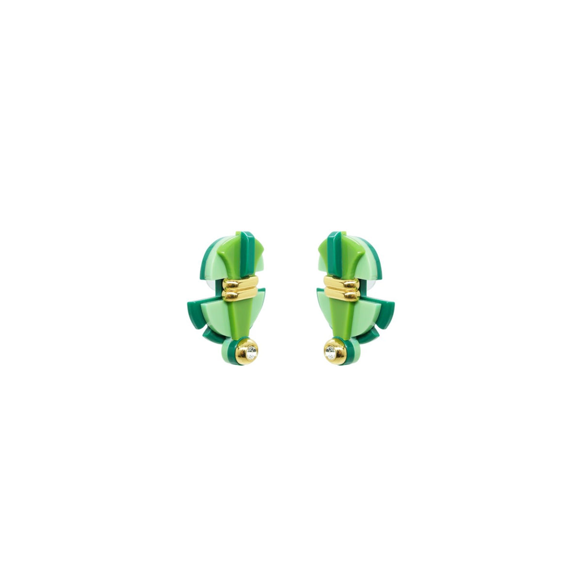 These Acrylic Handmade Earring Buriti Pale Green by Gissa Bicalho are a unique and artistic accessory. Handcrafted by Brazilian artisans, these earrings are made from acrylic and feature glass rhinestones, a zamak piece, and gold-finished brass metal. The unique design and color make them a versatile statement piece that adds an elegant flair to any outfit.