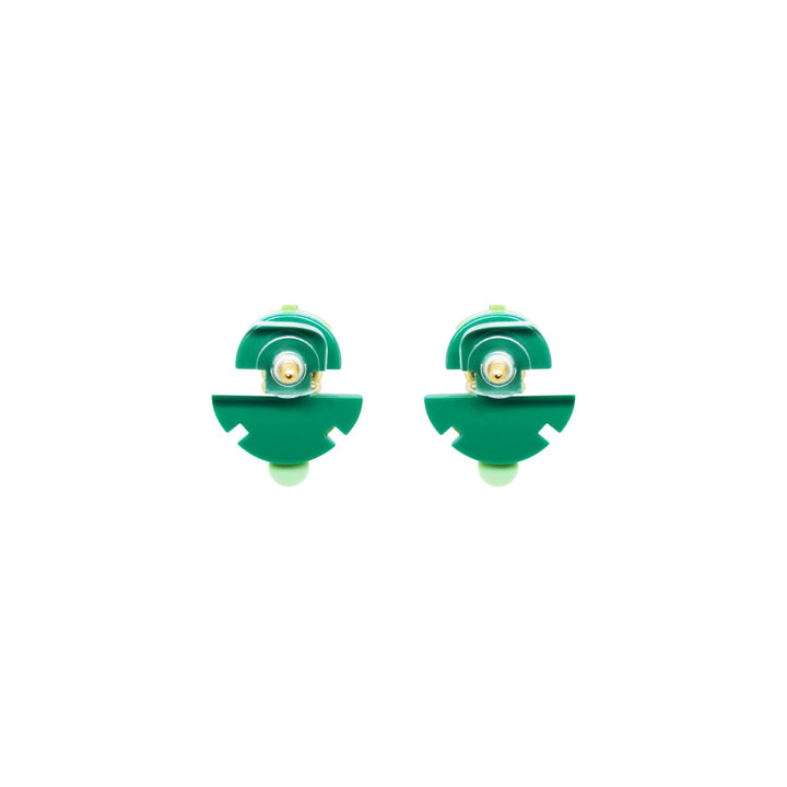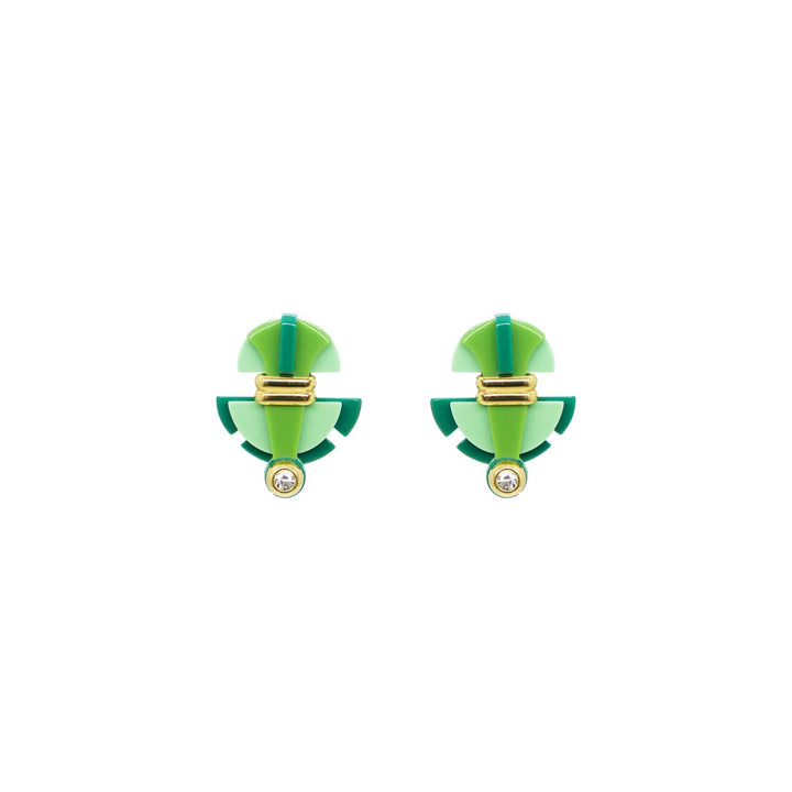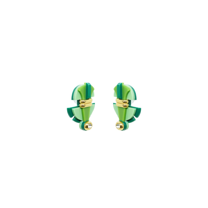 These handmade earrings are made from acrylic. They feature glass rhinestones, a zamak piece, and golden finished brass metal. The pin is made of stainless steel.
