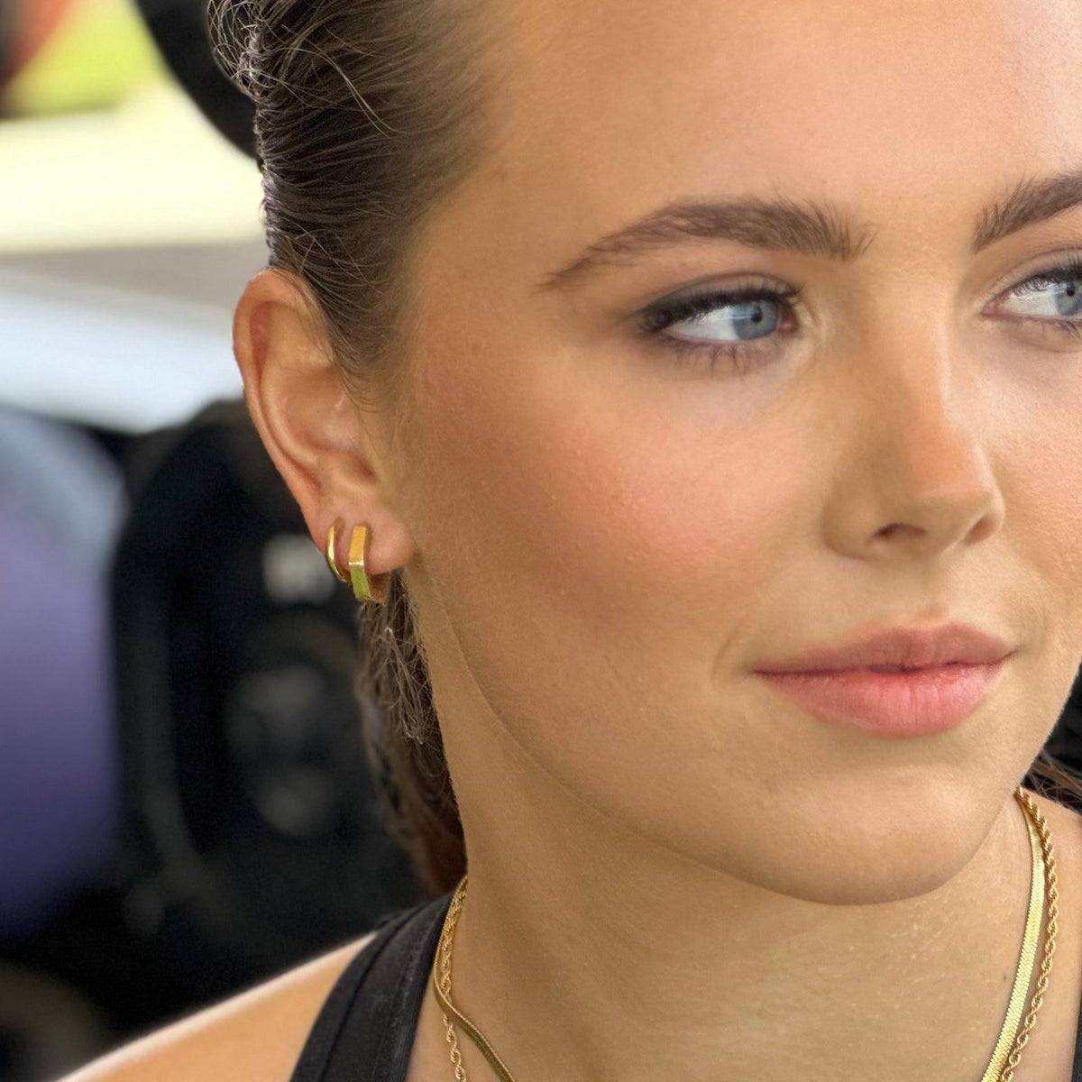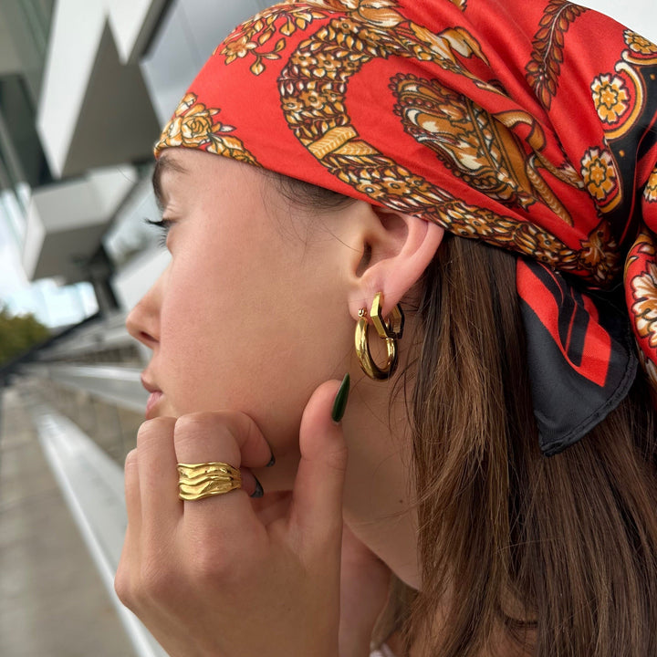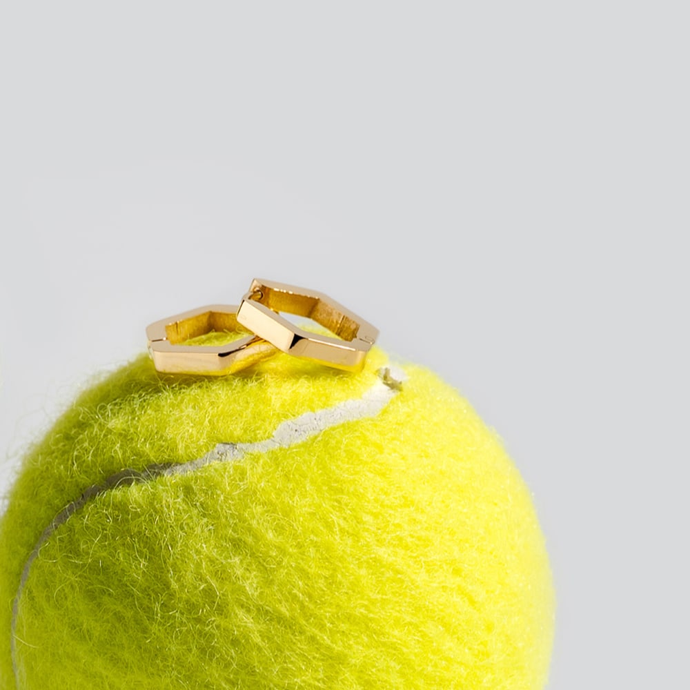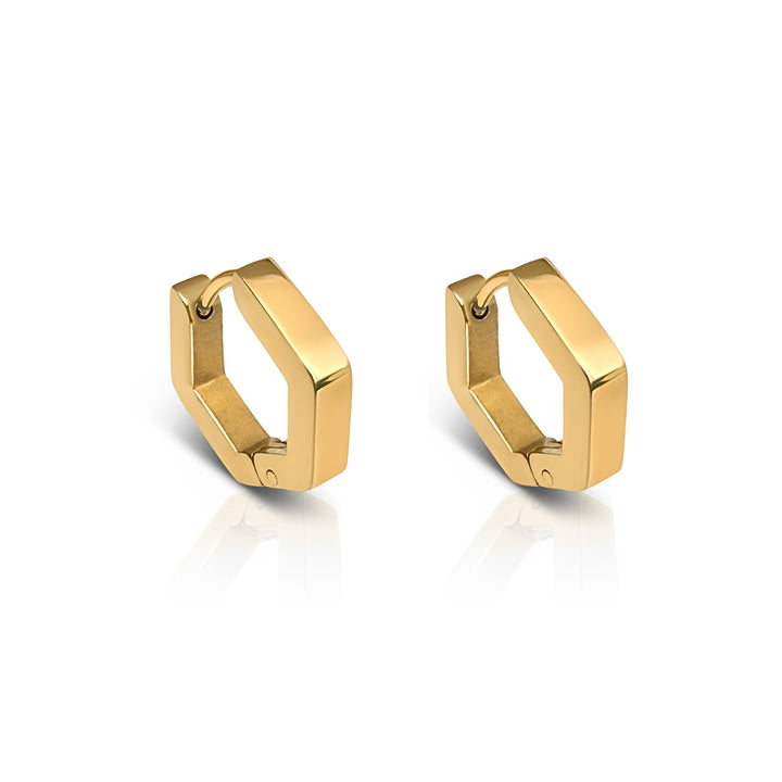 These hoops are crafted from 18k gold-plated stainless steel. They are designed with a geometric silhouette and are waterproof, sweat-proof, and anti-tarnish.