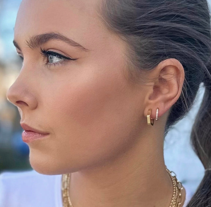 These Fast Break Gold Waterproof Hoop Earrings by Ever Jewellery are a modern and powerful accessory. The design features sleek edges and geometric angles, setting them apart from classic hoops. Their polished gold finish and clean lines create a high-impact look that is both refined and strong. Crafted to be waterproof and anti-tarnish, these lightweight hoops are perfect for daily wear, whether you’re headed to a workout or a power meeting.