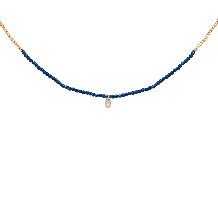 18k gold-plated brass. Features lapis lazuli beads, crystal beads, and central cubic zirconia. Length 15" with 2" extender chain.