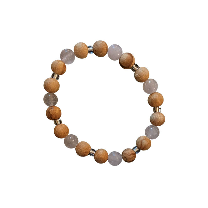 This bracelet is made from Palo Santo wood and Rose Quartz beads. It is a stretch bracelet.