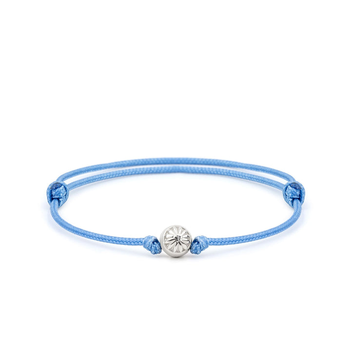 This sliding knot bracelet is made with Sterling silver 925 and White Rhodium plating. It has a sky-blue string and a 6mm bead. It is nickel-free.