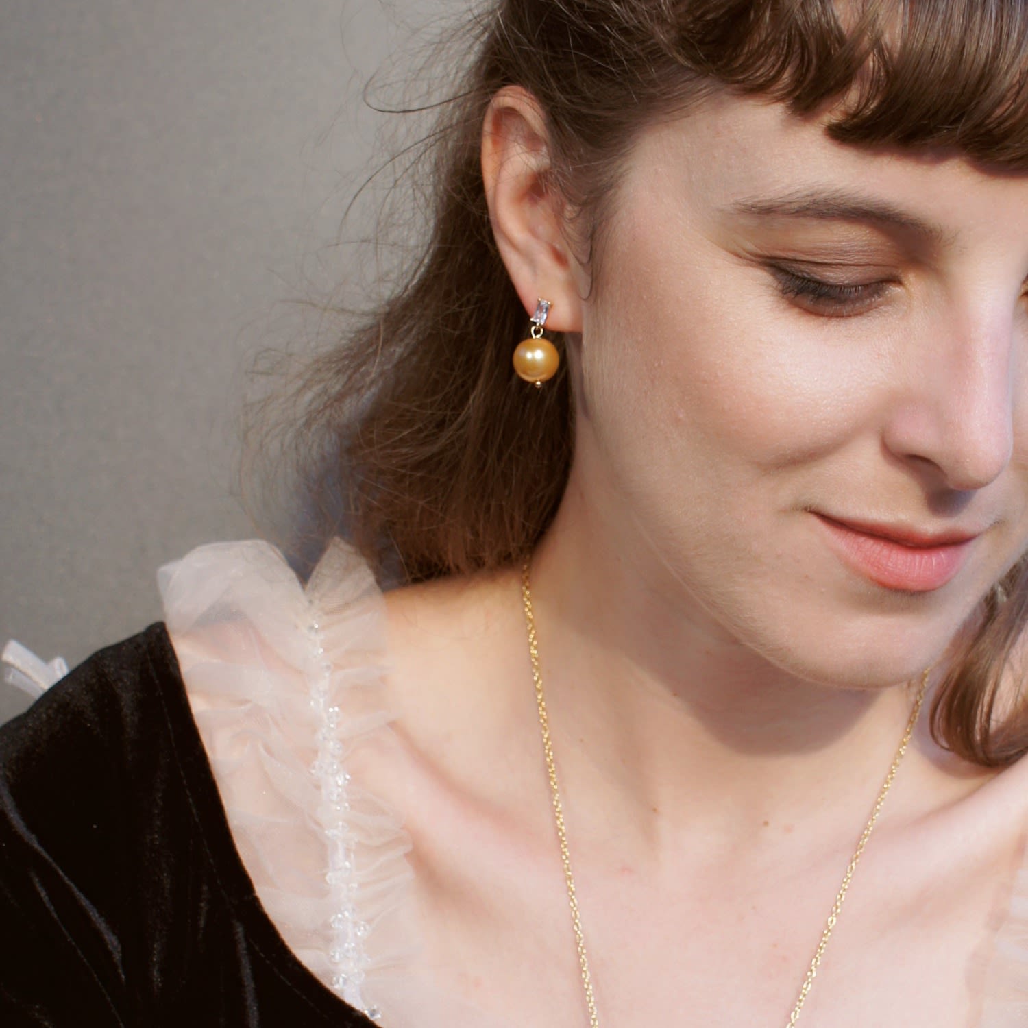 Handcrafted, these earrings are made with 18k gold-plated sterling silver, cubic zirconia crystals, gold-tone brass, and faux pearls.