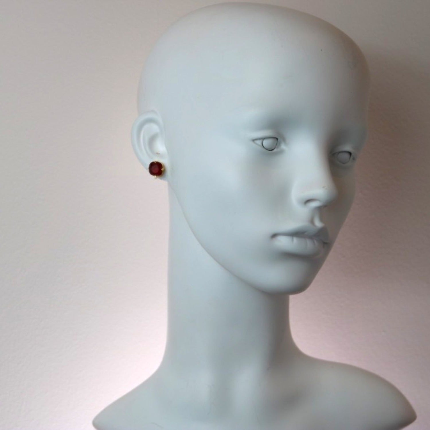 These stud earrings are made of 23k Gold plated Nickel-free Brass with Surgical Steel posts. They feature hand-tinted Premium Austrian Crystals in red.