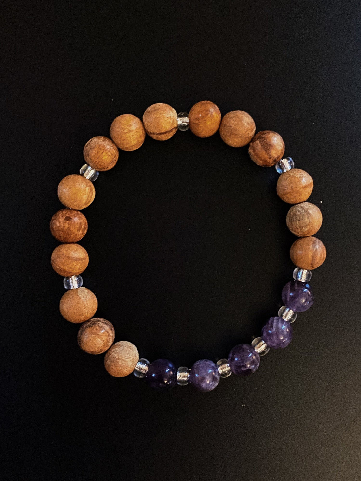 This stretch bracelet is made of Palo Santo wood and amethyst beads.