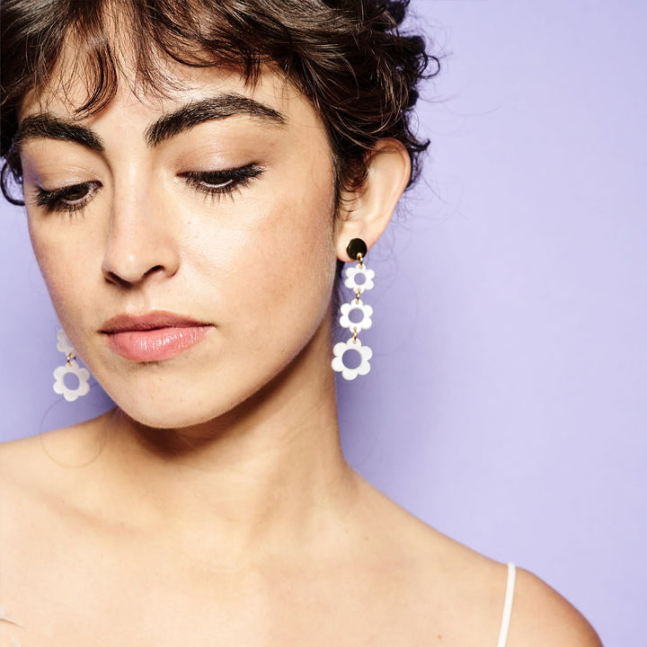 These Flower Drops - White by Toolally are a delightful accessory that adds a pop of vibrant color to any casual look. Inspired by the iconic 60s flower motif, these delicate floral drop earrings embody a sense of playful elegance and artistic charm. Their versatile design allows them to pair effortlessly with any outfit, making them a fun and timeless staple that celebrates a classic era of fashion.