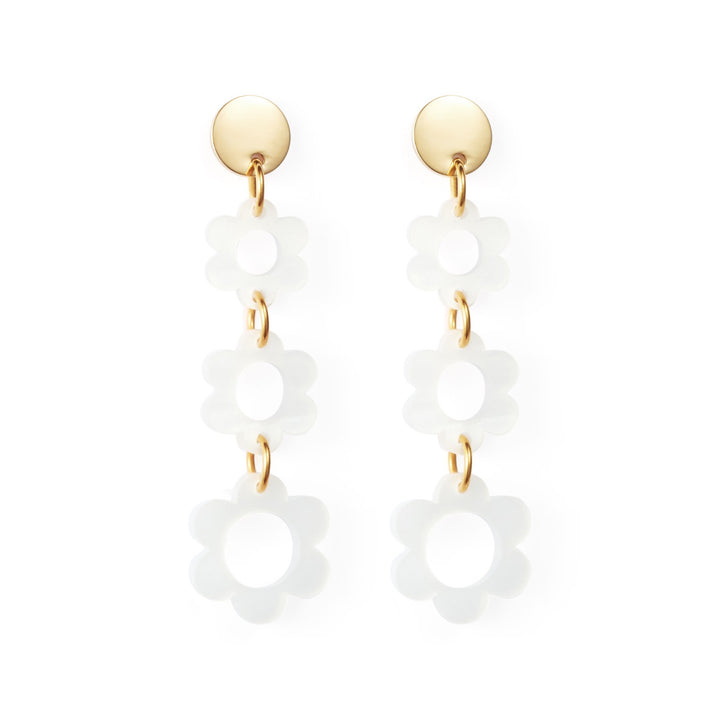 These earrings are crafted from acrylic in a delicate floral drop design with a white color.