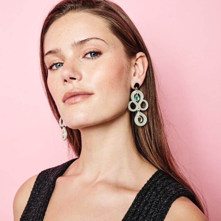 These Petite Batik Earrings - Regent Green & Iridescent by Toolally are a captivating and unique accessory inspired by an ancient art form. The intricate patterns and beautiful mix of crisp regent green and shimmering iridescent acrylic drops create a stunning statement that is both elegant and artistic. These earrings are perfect for adding a touch of bold, creative flair to your look, whether with a simple dress or an elaborate outfit. They embody a spiritual and expressive style that is truly one-of-a-kind.
