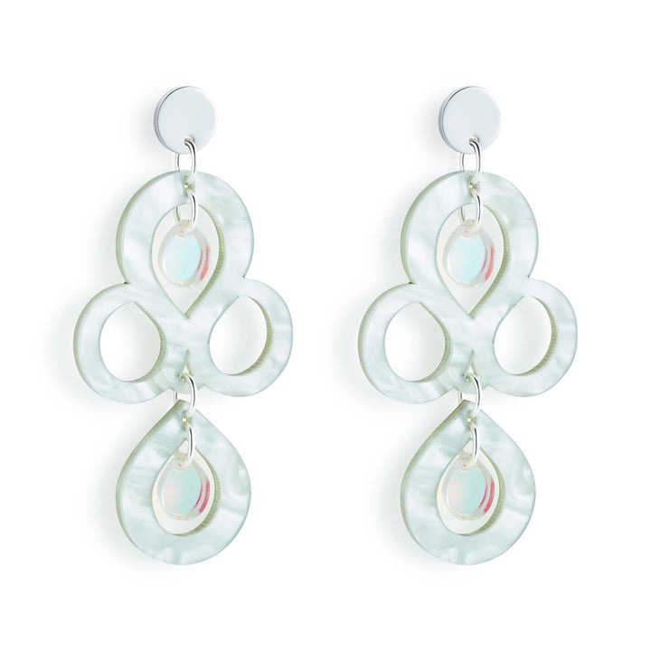 These drop earrings are made with acrylic and a surgical steel post with a sterling silver plated top. They feature regent green and iridescent acrylic drops.