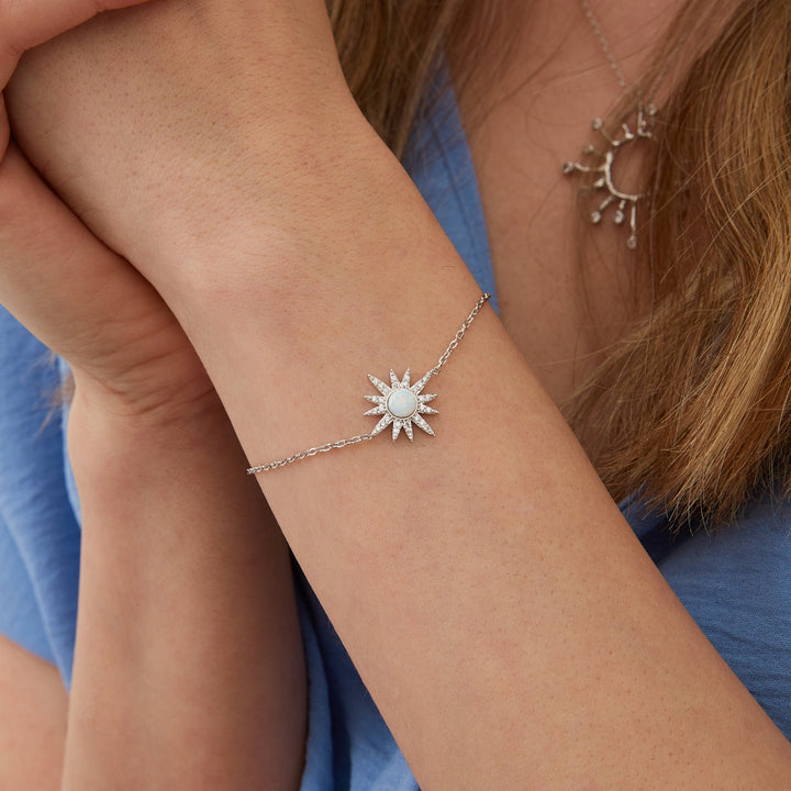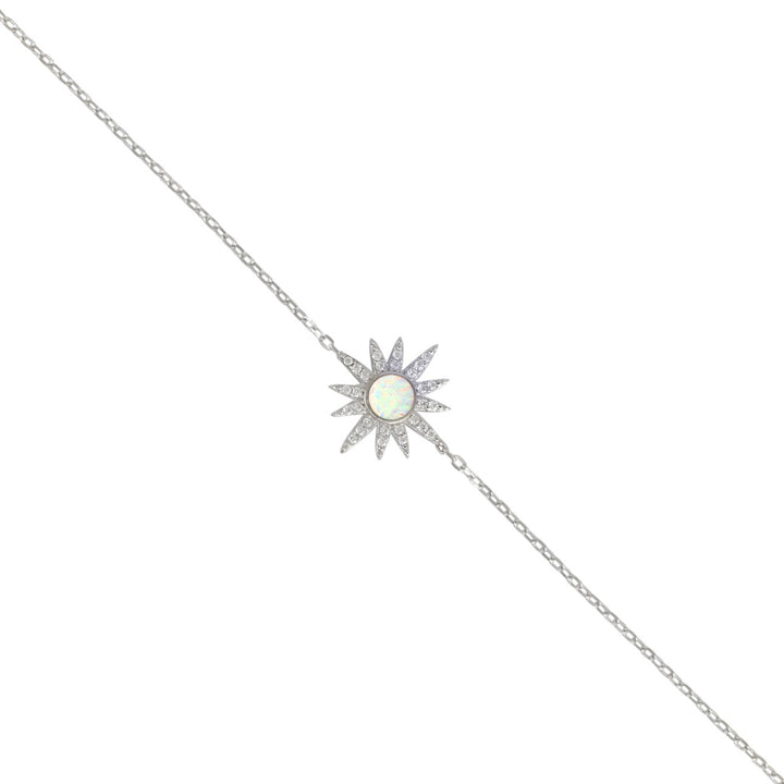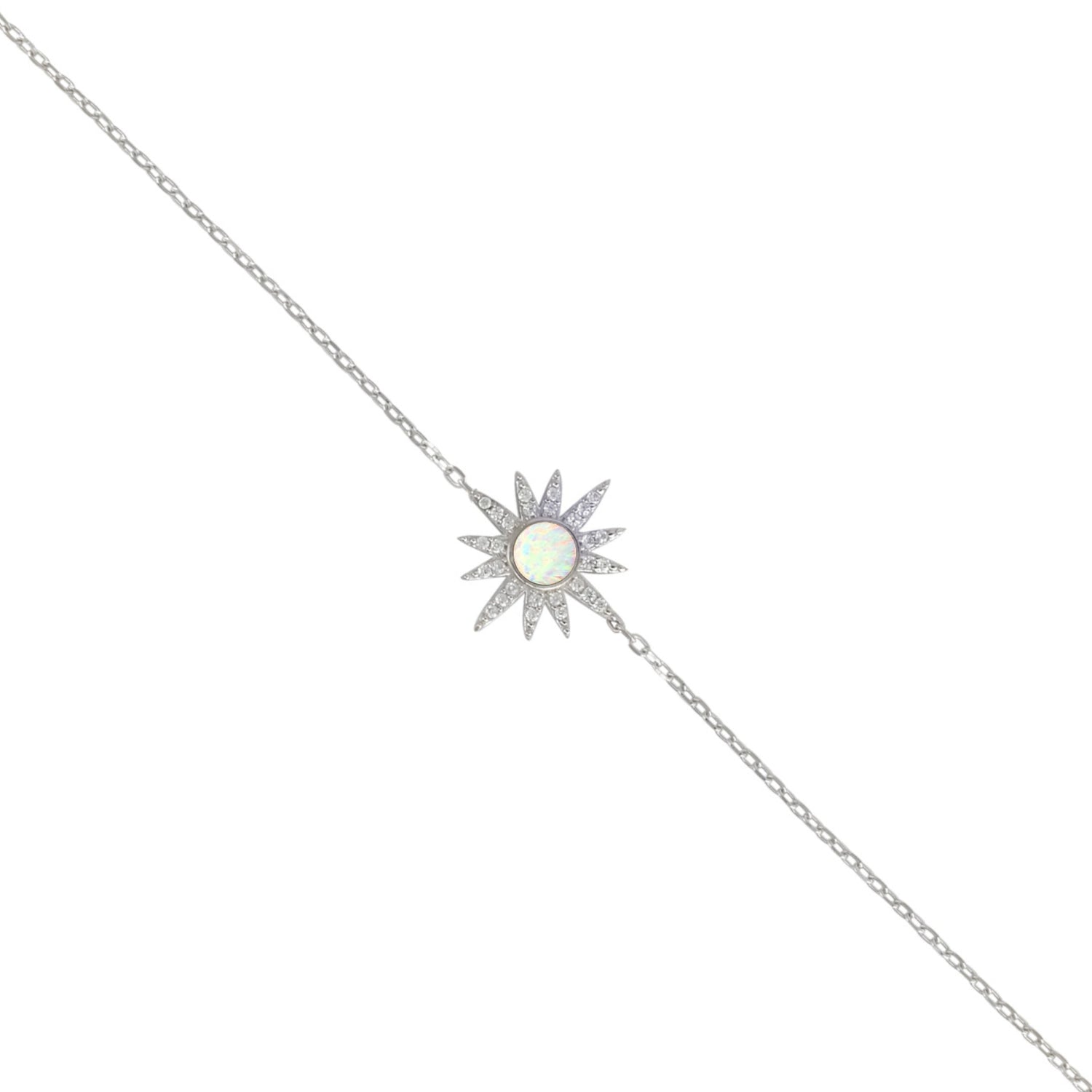 This bracelet is crafted from sterling silver and features shimmering opal stones in a sun design.