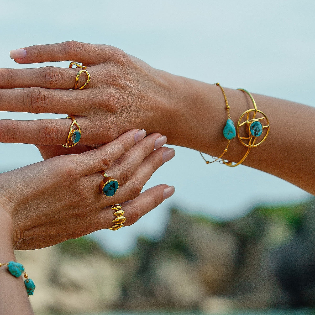 This Turquoise Beaded Chain Gold Bracelet by Mejoma is a luxurious and eye-catching statement piece. The vibrant turquoise beads add a pop of natural color to any outfit, while the delicate gold chain adds a touch of modern elegance. This one-of-a-kind bracelet celebrates the unique irregularities of the natural gemstones, making it a truly special accessory.
