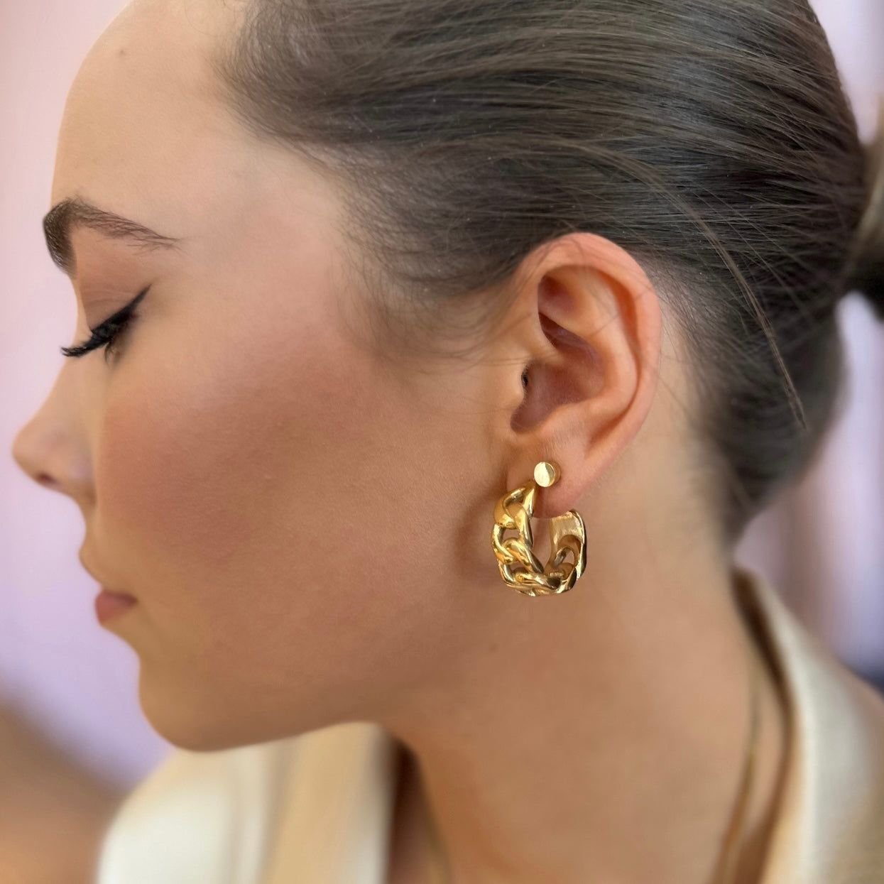 Groove Gold Statement Waterproof Hoop Earrings by Ever Jewellery are a bold yet elegant accessory. These hoops feature a distinctive chain-link silhouette, striking a perfect balance of strength and modern design. They are hypoallergenic and designed to be water, sweat, and tarnish-resistant, making them perfect for everyday wear. These go-to hoops can be worn solo for a statement or stacked for a more layered look.