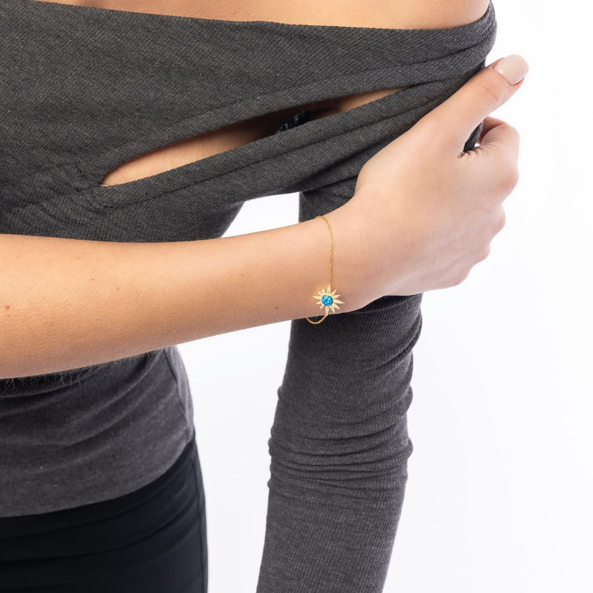 This adjustable bracelet is crafted from 925 recycled sterling silver with a gold finish. It features a sun motif set with cubic zirconia and blue opal.