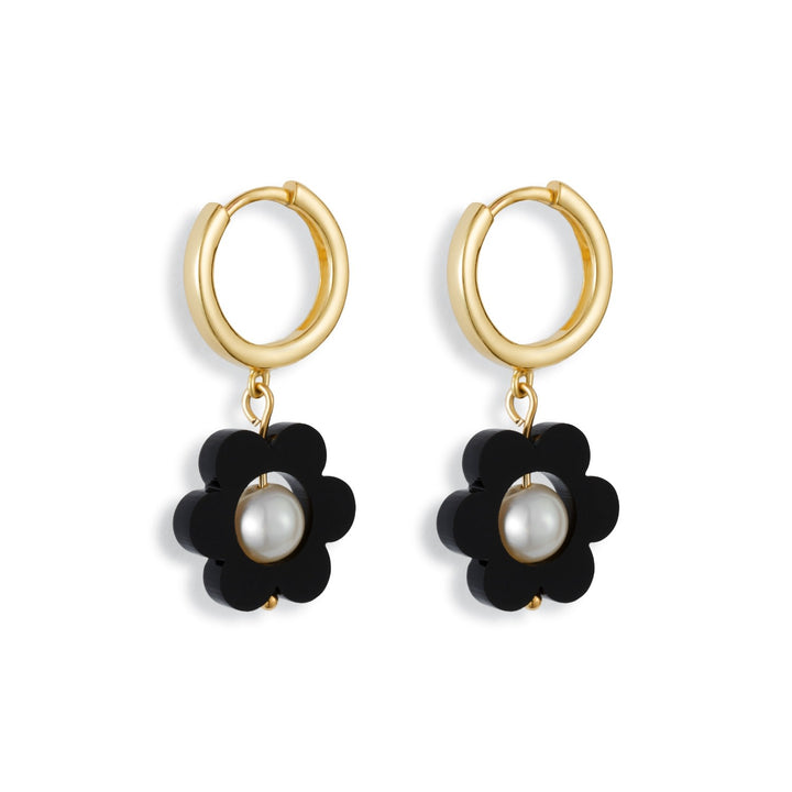 These huggie earrings are made of 18ct gold vermeil and feature a freshwater pearl and a black flower motif. The brand offers repair, re-plating, and polishing services.