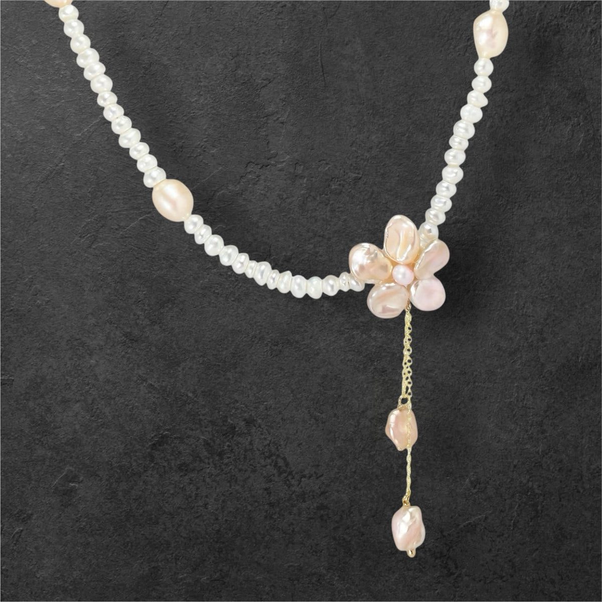 The Aurelie Petal Necklace by Ninemoo is a delicate and poetic piece, perfect for special occasions. It features a central floral motif formed by petal-shaped freshwater pearls, complemented by gently cascading pearl drops. Each necklace is meticulously hand-strung with natural pearls, giving it a unique touch. Elegant and timeless, this piece beautifully expresses grace and individuality, making it an ideal finishing touch for weddings, birthdays, or any intimate celebration.
