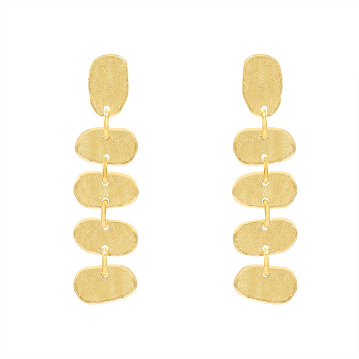 The Jolina Earrings by Marcia Moran are stylish and distinctive. These handmade earrings from Brazil feature an 18k gold plated, brushed, organic, coin-shaped cluster design. The use of natural semi-precious stones means each piece may vary slightly, adding to its unique charm. The earrings are made of precious and non-precious metals plated in 18K gold.