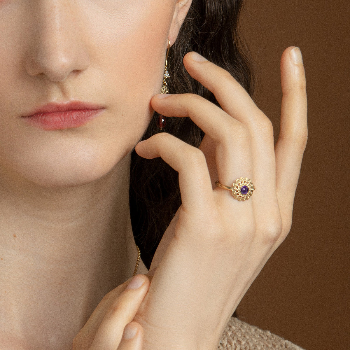 Sterling silver plated in 18K gold (1 micron), with amethyst. Palladium layer for anti-oxidation. Nickel-free. Handmade in Italy.