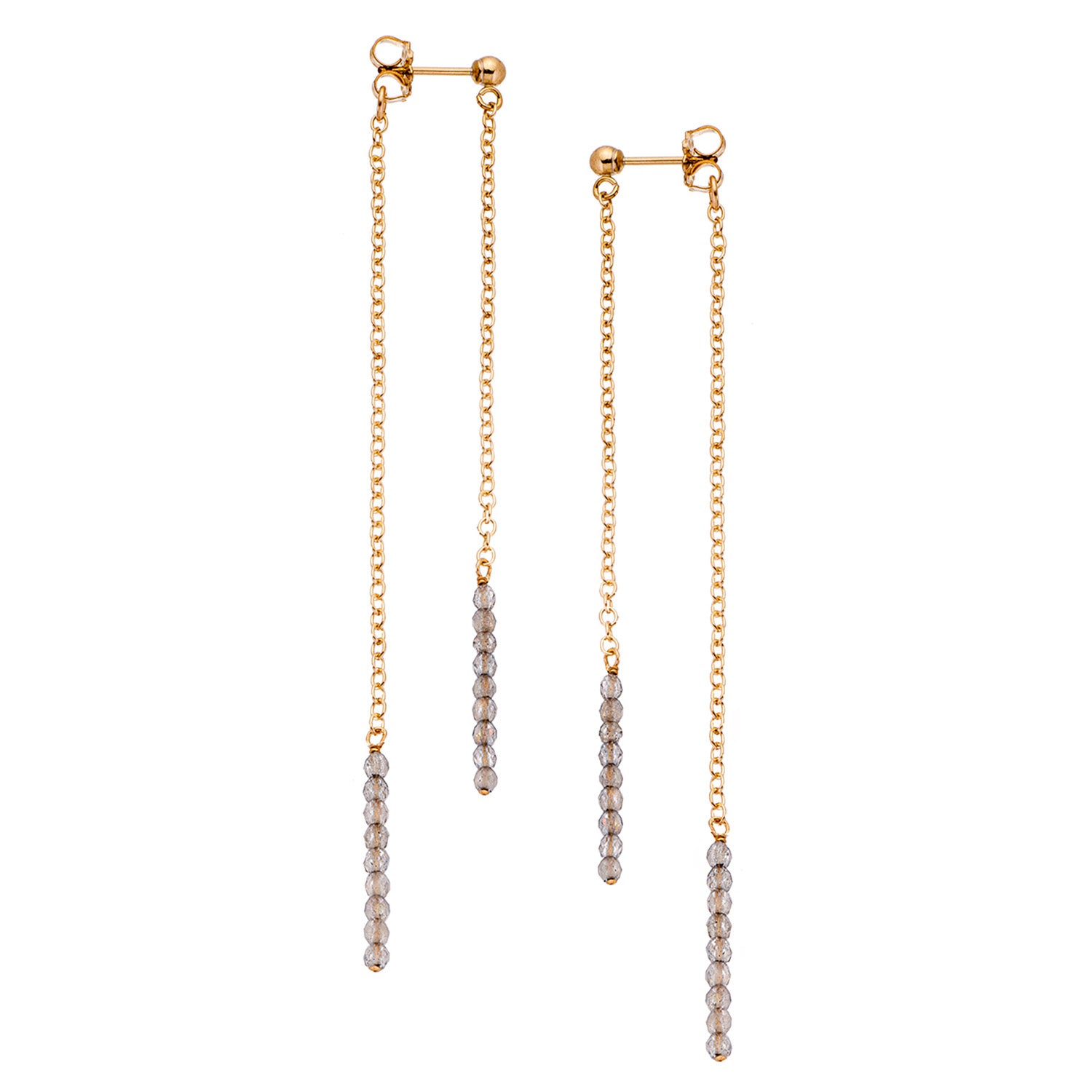 These earrings are handmade with 14K gold-filled chains and post-back ear wires. They feature extra tiny 2mm genuine labradorite gemstone beads and measure 4.25 inches (108mm) long at the longest point.