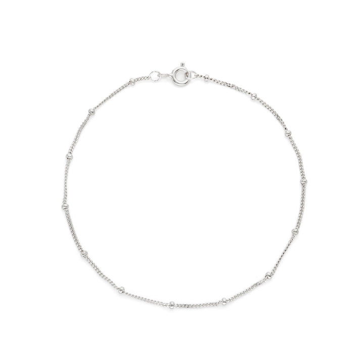 This bracelet is made of sterling silver with a fine beaded chain. It is fastened with a lobster clasp.