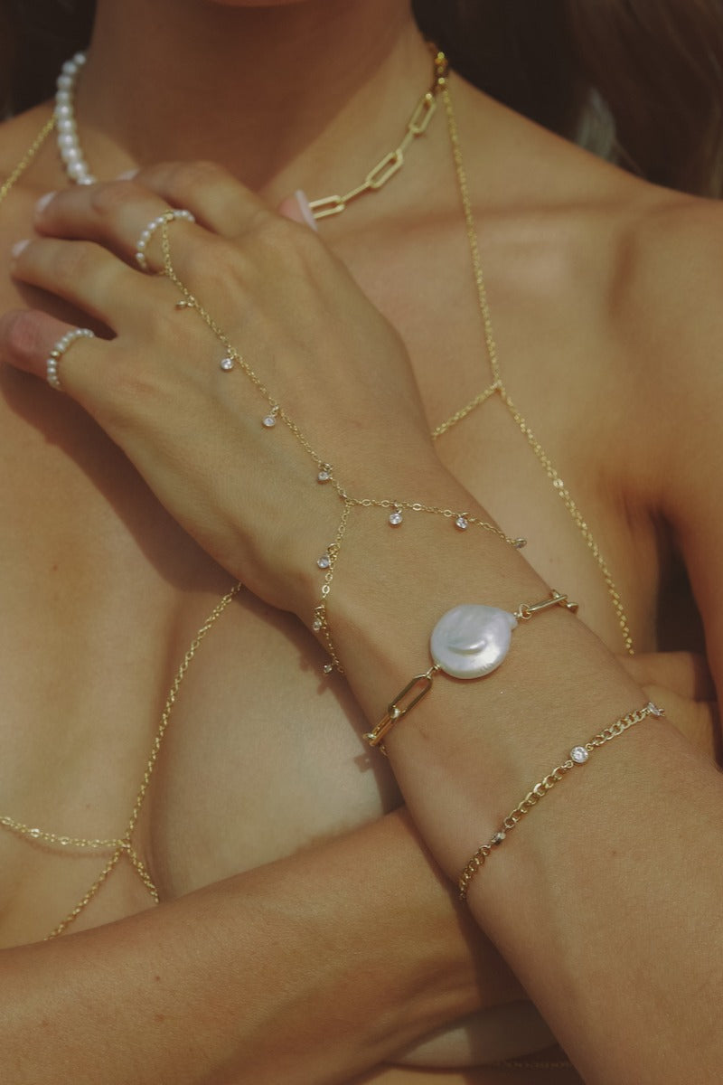 This bracelet is handmade with a 14K gold-filled Cuban link chain and features bezel-set white cubic zirconia (CZ) gemstones.