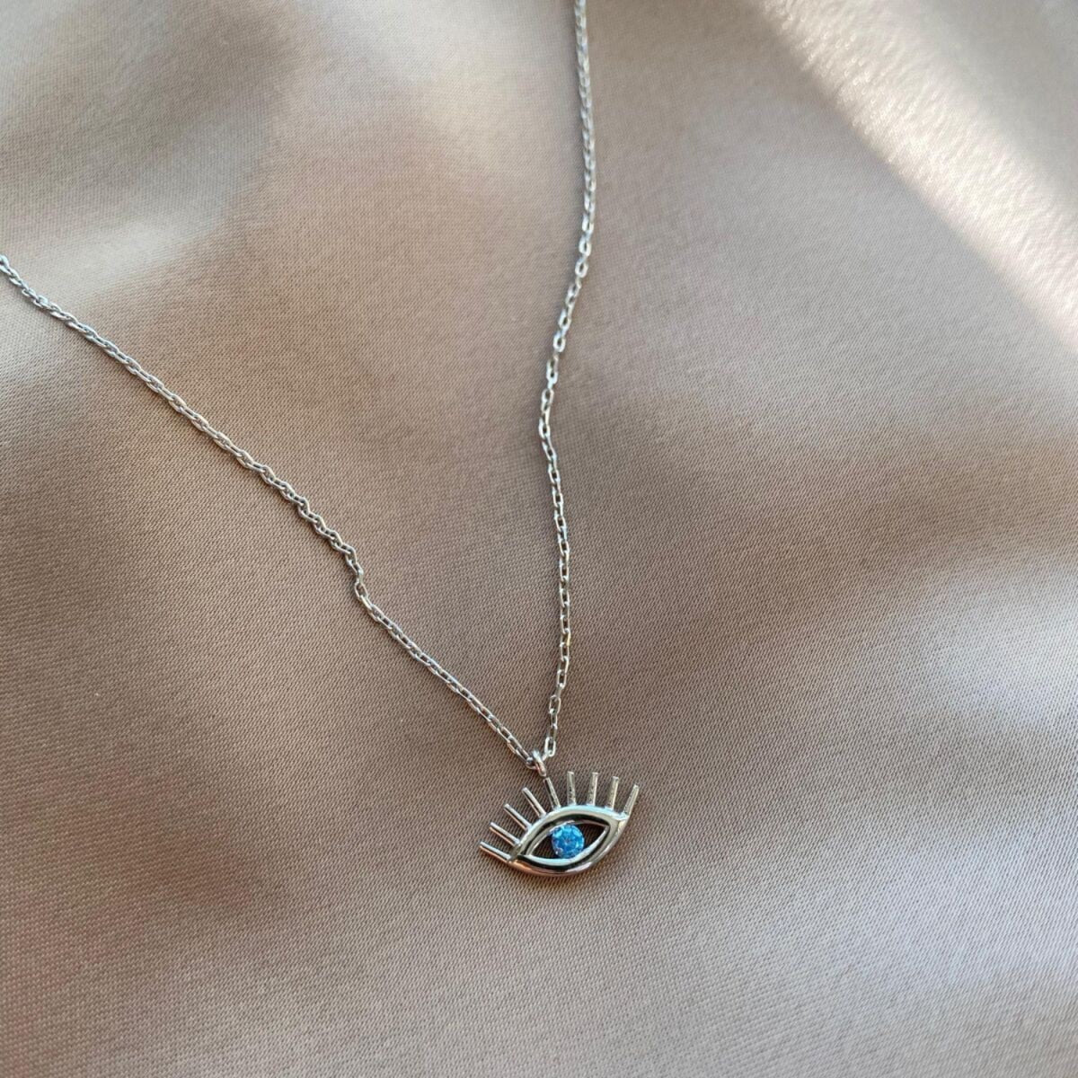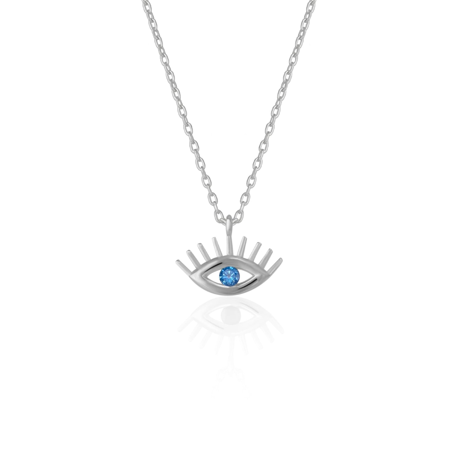 This necklace is made from sterling silver and features an evil eye charm with an aqua blue color. It comes with sustainable packaging.