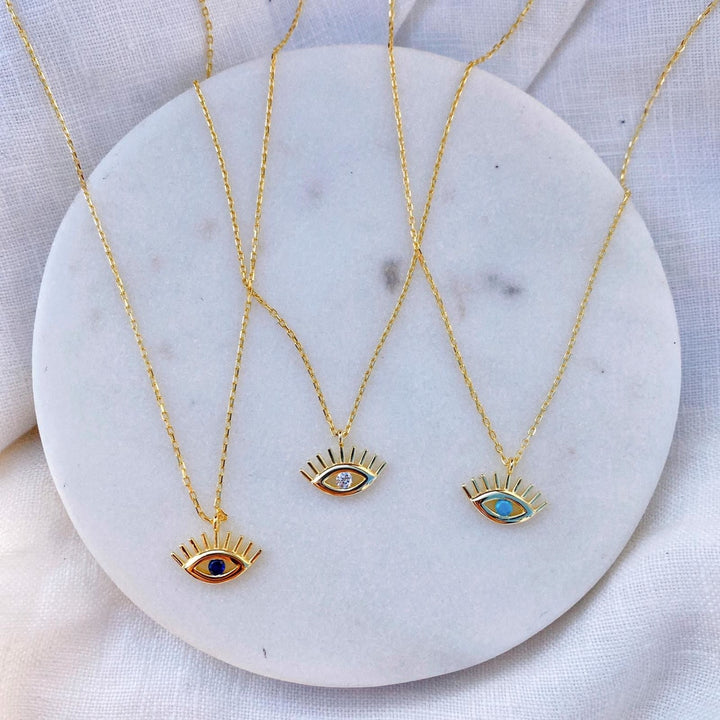 This necklace is made from sterling silver and features an evil eye charm with a blue color. It comes with sustainable packaging.